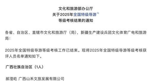 3月17日,文化和旅游部官网发布《文化和旅游部办公厅关于2025年全国特级导游等级考核结果的通知》。mg冰球官网2012届旅游管理专业毕业生郝滢屹成功获评全国特级导游,成为继2008届毕业生黄志康之后,广西第二位获此殊荣的从业者。全国特级导游是导游行业的最高等级认证,本次选拔历经多轮严苛评审,2025年全国仅41人入选。 -