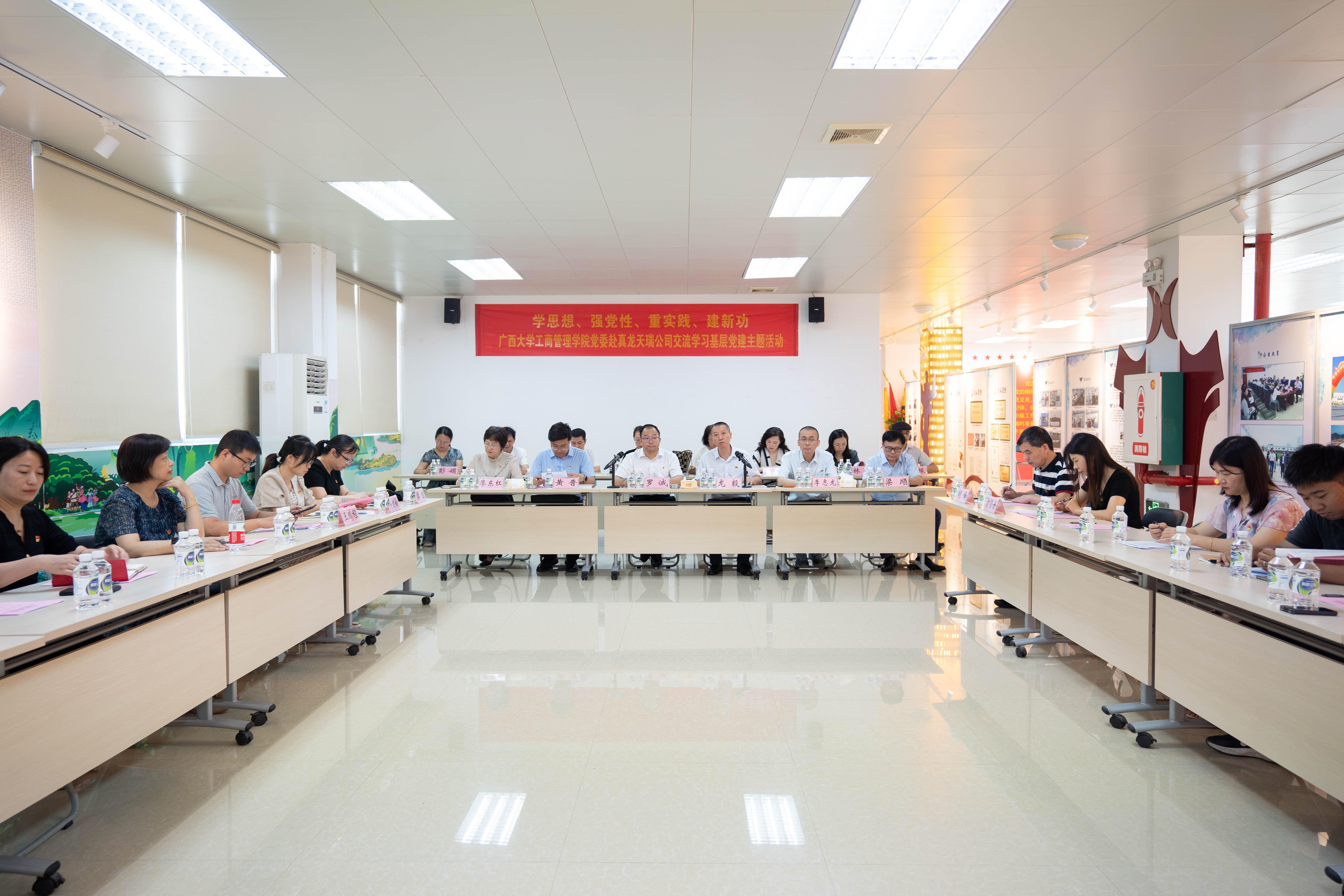 为进一步提高基层党建质量及管理水平,7月7日上午,mg冰球官网党委书记罗诚率教工行政党支部、教工企管党支部、教工财会党支部和教工旅管党支部的支委和党员代表赴广西真龙天瑞彩印包装有限公司党支部开展学习交流。真龙天瑞党支部隶属中共广西中烟天成投资管理有限责任公司党总支部管辖,努力打造“价值党建”品牌,推进党建与业务深度融合,是南宁高新区两新组织党建示范点。党委副书记黄晋、副院长廖东红、组织员黄照温参加了活动。活动由广西中烟天成投资管理有限责任公司(以下简称“天成投资”)董事长龙毅主持。