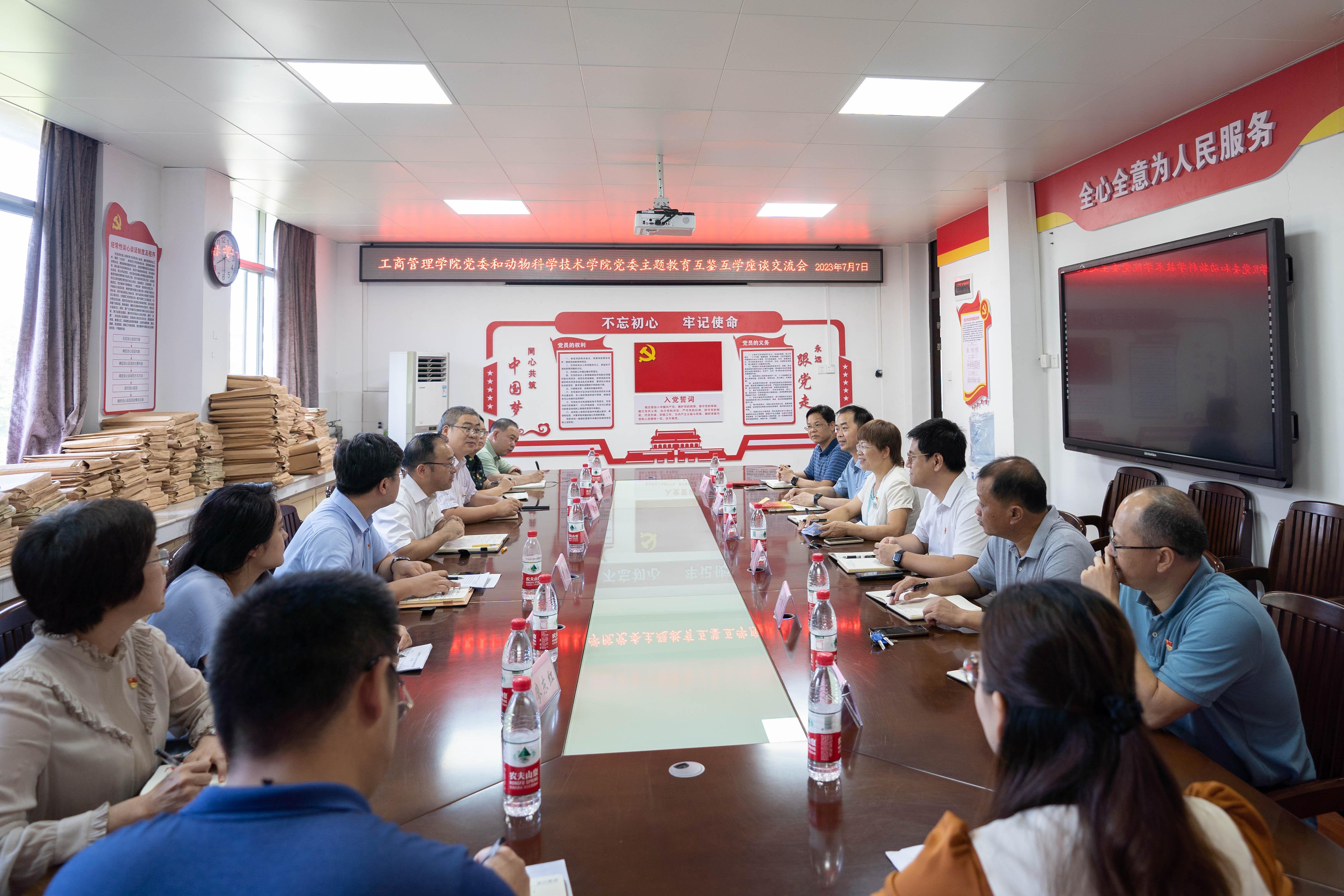 7月7日上午,mg冰球突破试玩党委与动物科学技术学院党委在动物科学技术学院302会议室举行主题教育互鉴互学座谈交流会。统战部閤明勇副部长,督导组成员田春、刘小燕到会指导。