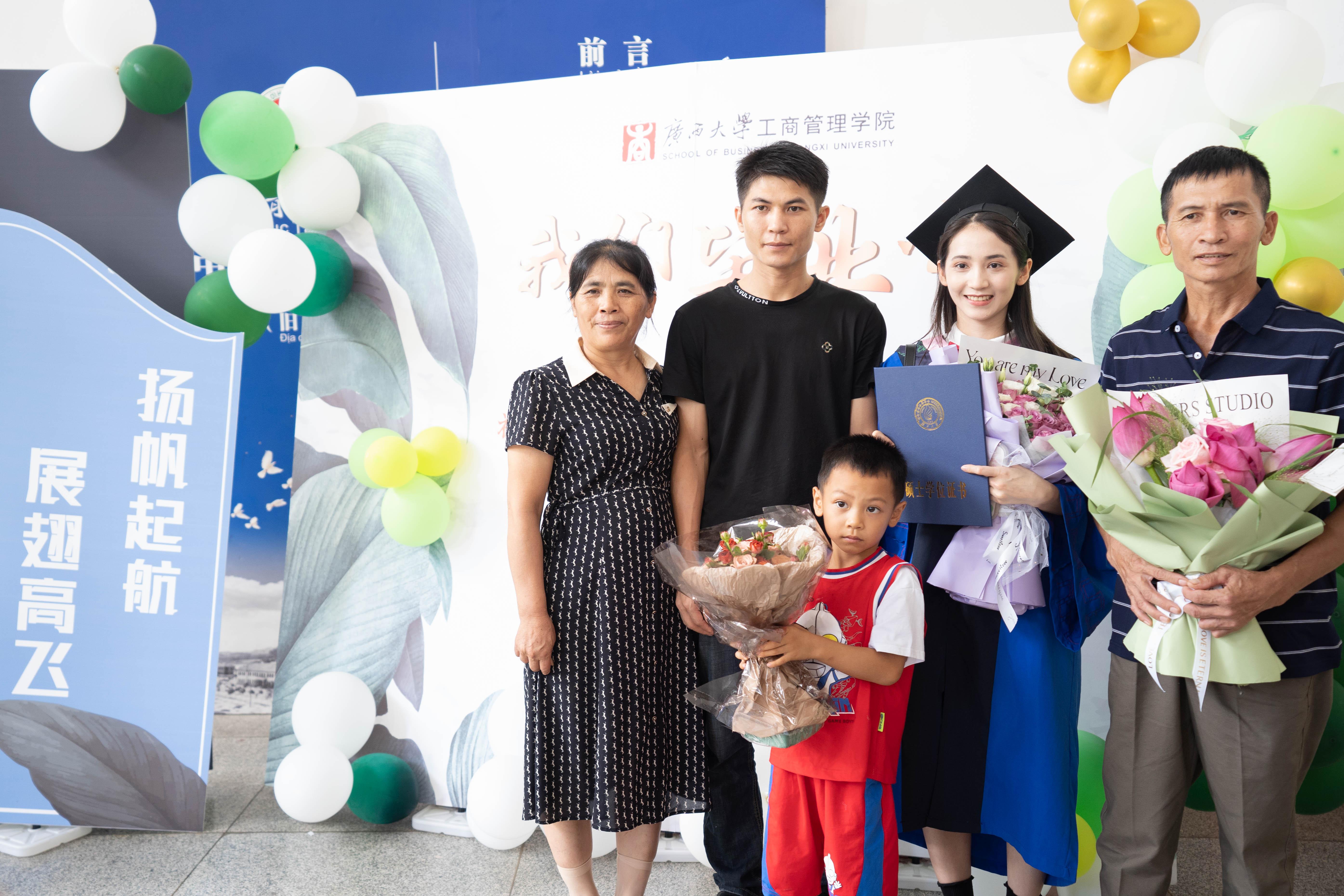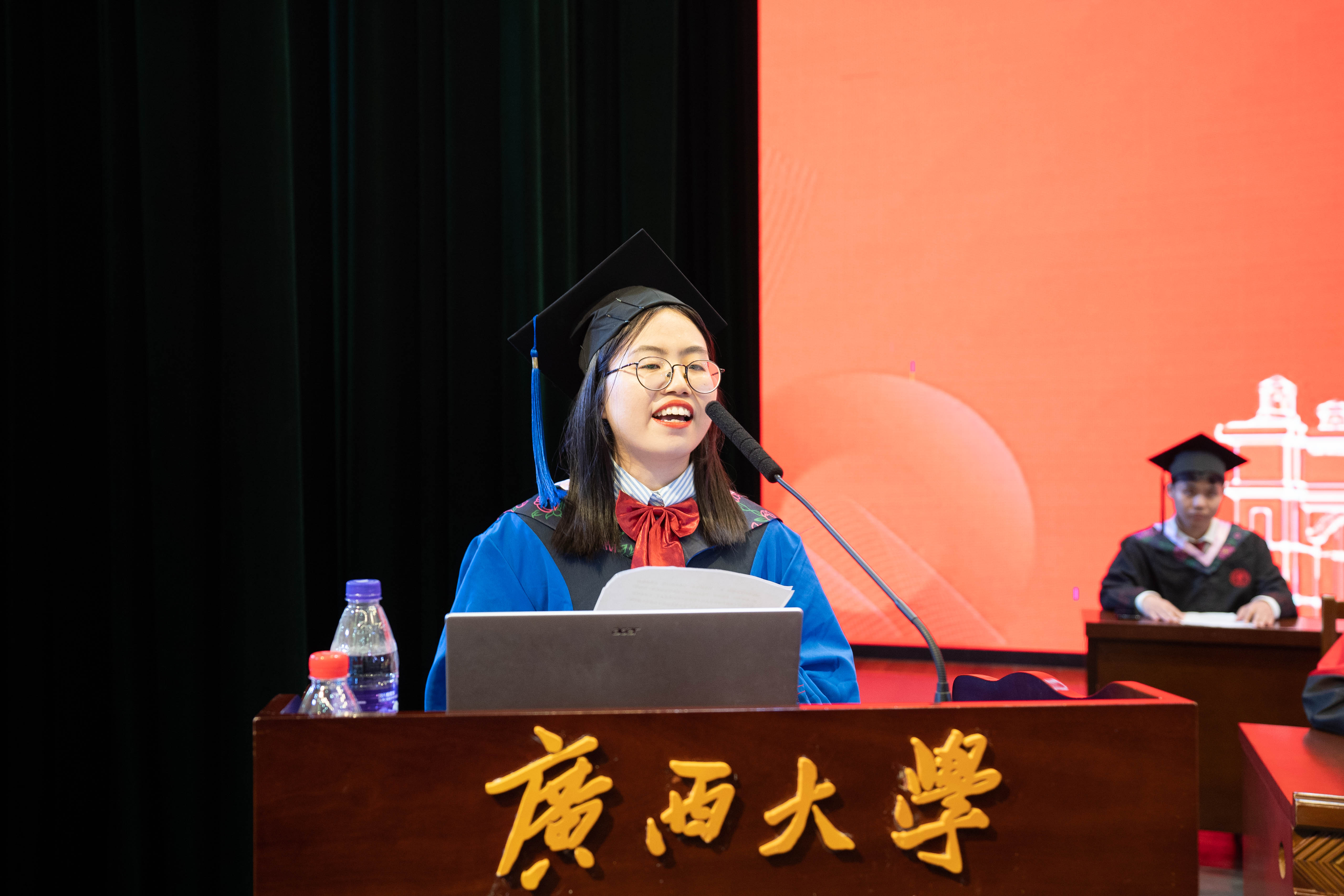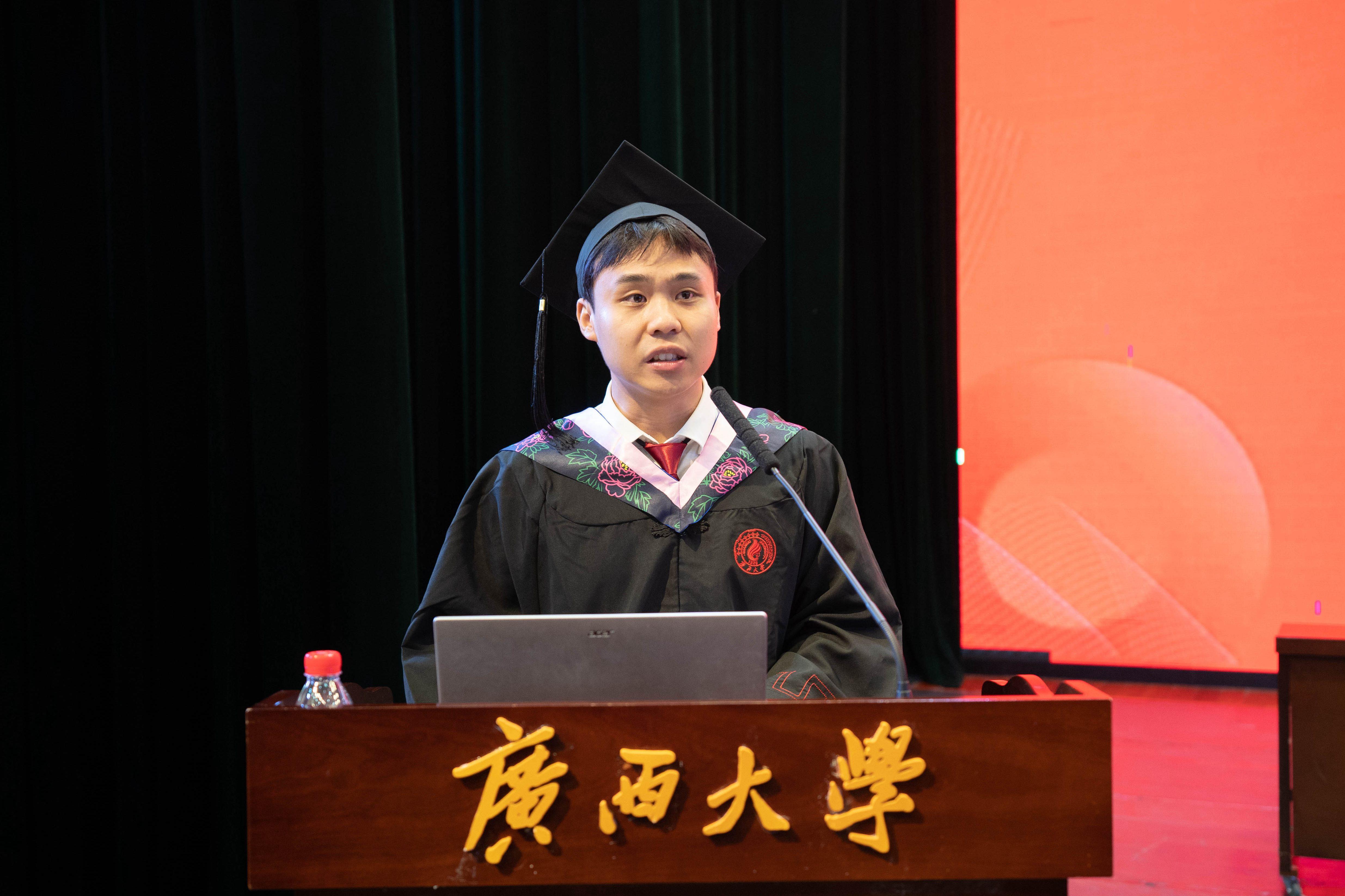 本科毕业生代表、会计学192班陆泳彬在发言中向四年如一日关心和教导他们的领导和老师表示最崇高的敬意。已顺利通过定向选调生选拔的他表示,将用“不畏浮云遮望眼”的勇气,用“不知细叶谁裁出”的方式,用“不要人夸颜色好”的态度奉献基层,努力践行一名西大学子、商管学子的责任与担当。