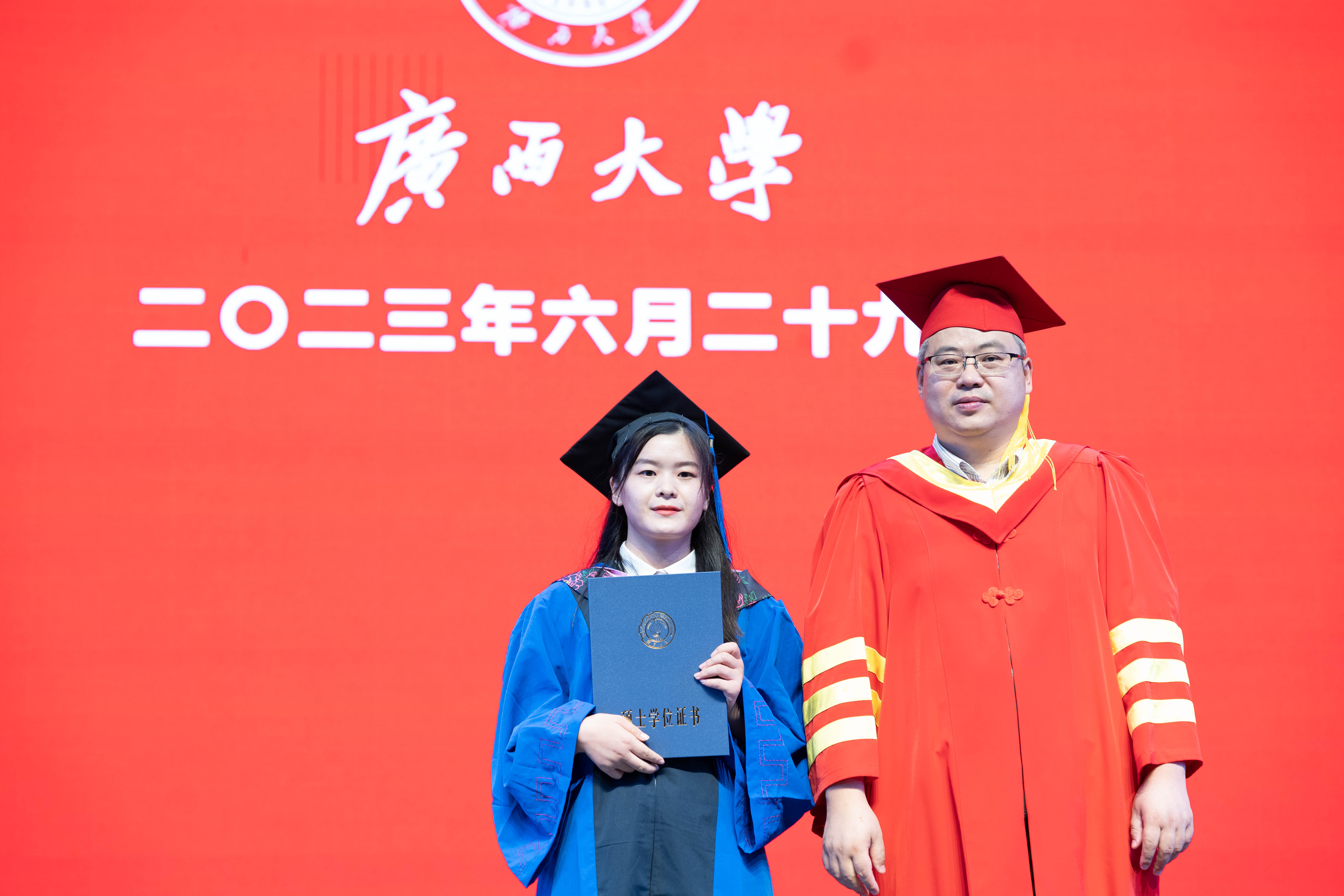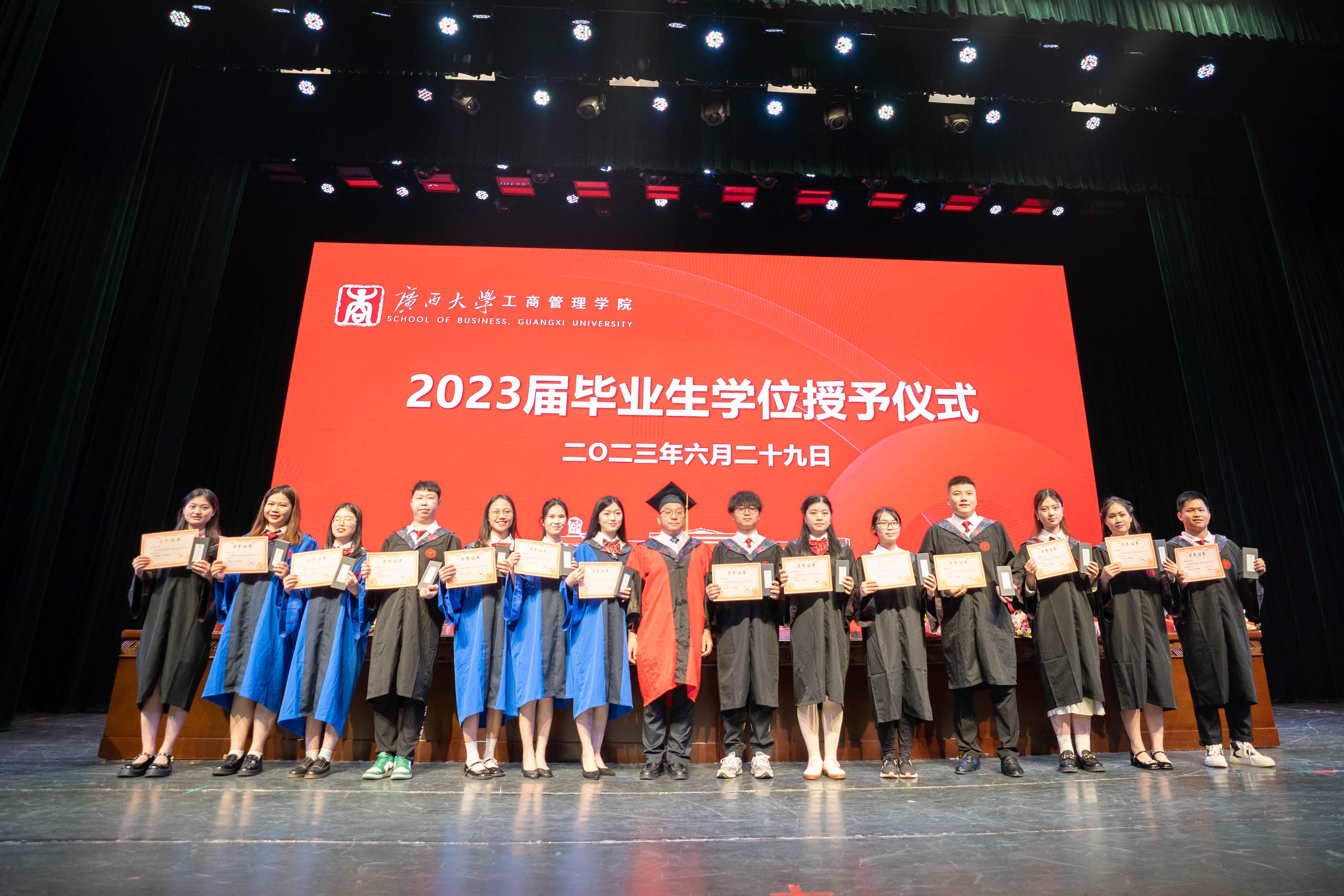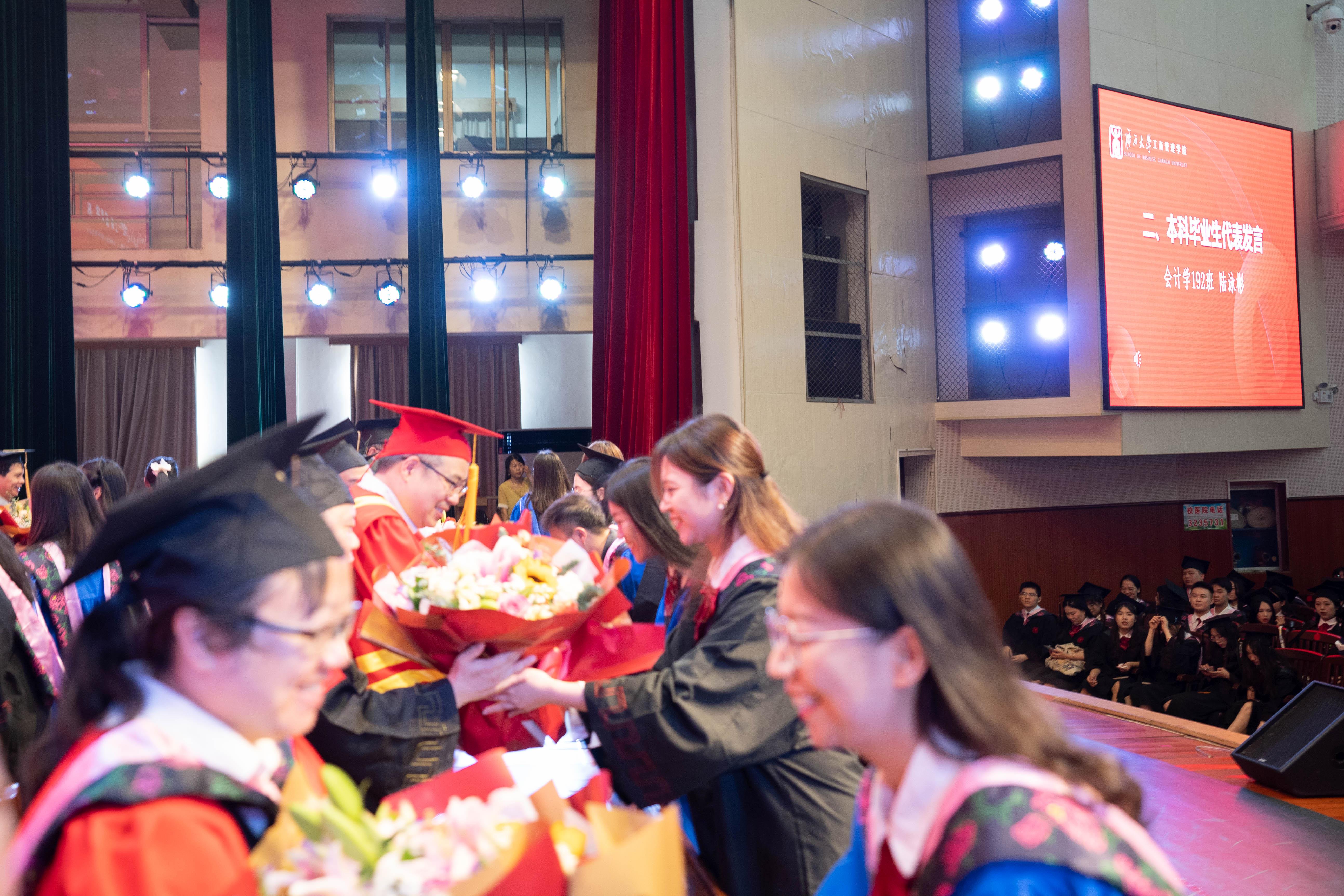 在雄壮激昂的国歌奏唱中,本届毕业典礼暨学位授予仪式拉开帷幕。学院党委书记罗诚为获得广西普通高等教育优秀毕业生、mg冰球突破试玩优秀毕业生荣誉的毕业生代表颁发证书,并赠送毕业礼物。