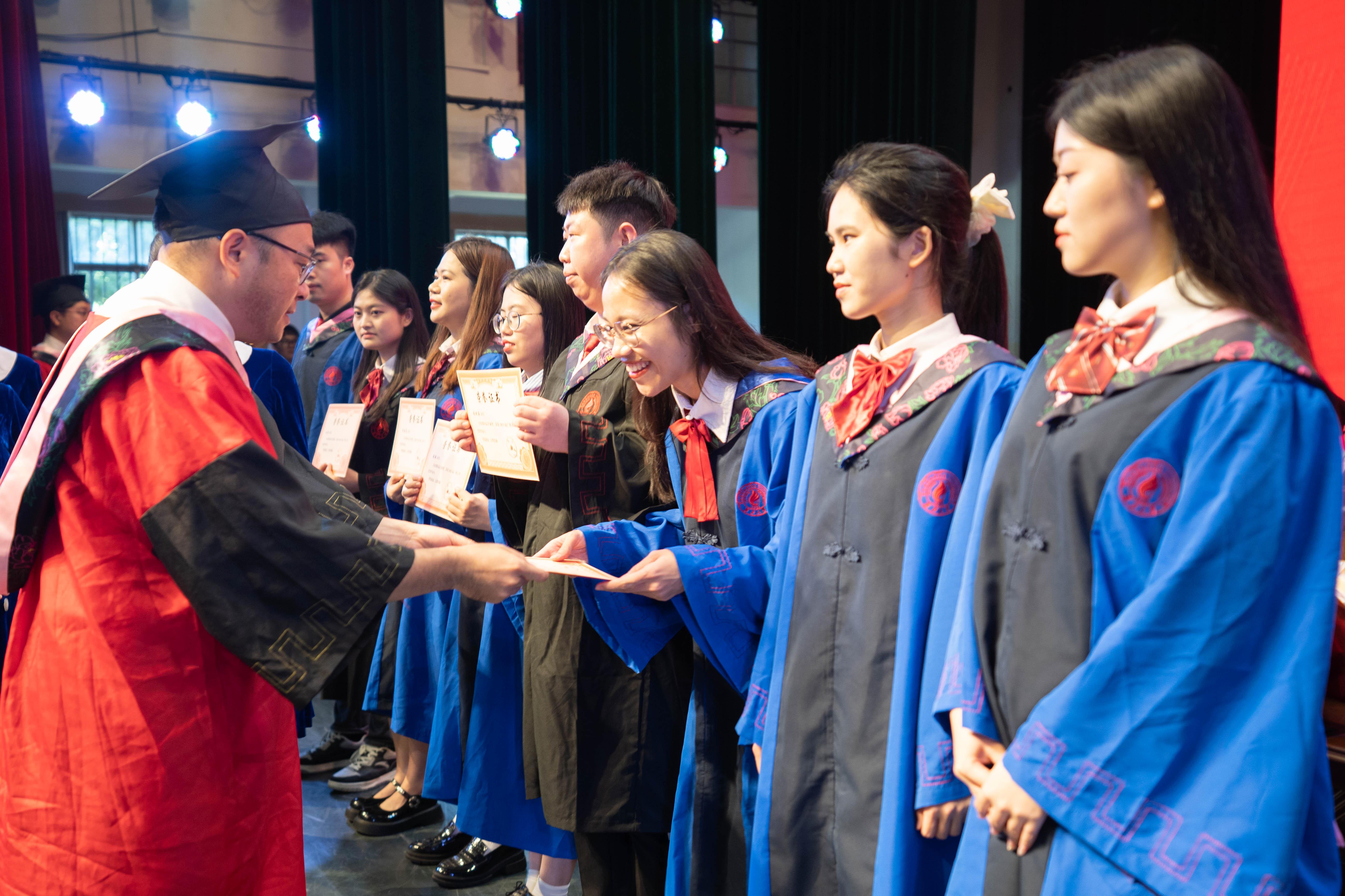 随后举行学位授予仪式,mg冰球官网毕业生依次走上主席台接受授位。朱帮助院长为每一位毕业生颁授证书、拨穗正冠,各系教师代表与毕业生握手。