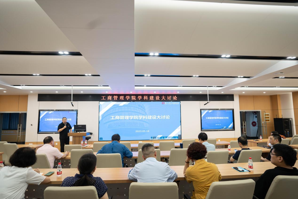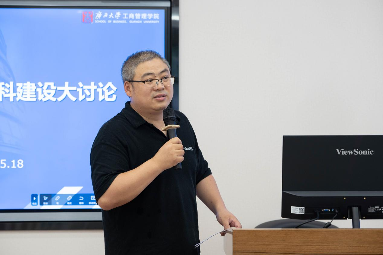 会上,朱帮助院长传达了“学校领导班子学习贯彻习近平新时代中国特色社会主义思想主题教育读书班调研应用经济学与现代服务业学科群建设座谈会”精神,并从学院层面就工商管理学科如何围绕一流学科、应用经济学与现代服务业学科群和地方经济社会发展的趋势进行规划和工作部署。朱帮助院长强调,本次大讨论要以主题教育为契机,深入学习贯彻习近平总书记重要讲话精神,切实落实王书记、韩校长关于一流学科群建设的指示,深入谋划学院学科建设,精心构筑“四梁八柱”,推动思想大解放、能力大提升、作风大转变、工作大落实。一要认清国家战略和区域经济社会建设是我们发展的主战场,扎实推进学科服务于区域经济社会发展的关键领域,紧抓西部陆海新通道、平陆运河、海洋经济、中国-东盟商务管理等区域经济社会发展的重大问题开展学科规划和建设;二要处理好学科建设与专业建设的关系,统筹学科底色和特色,做好学科普遍性和地方特殊性的结合,以此为核心强化专业的底色凝练和特色构建工作;三要以有组织的学术科研汇聚多学科人才和创新能量,打造跨学科“大团队”,谋划“大项目”“大平台”,产出“大成果”。他希望全体教师统一思想,紧紧围绕学校的指挥棒,充分认识学科建设对学院发展的重大意义,主动融入、主动参与、献智献策,增强责任感、紧迫感和使命感,共同做好和全方位提高学科建设水平。