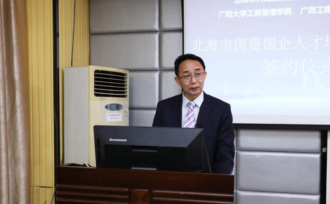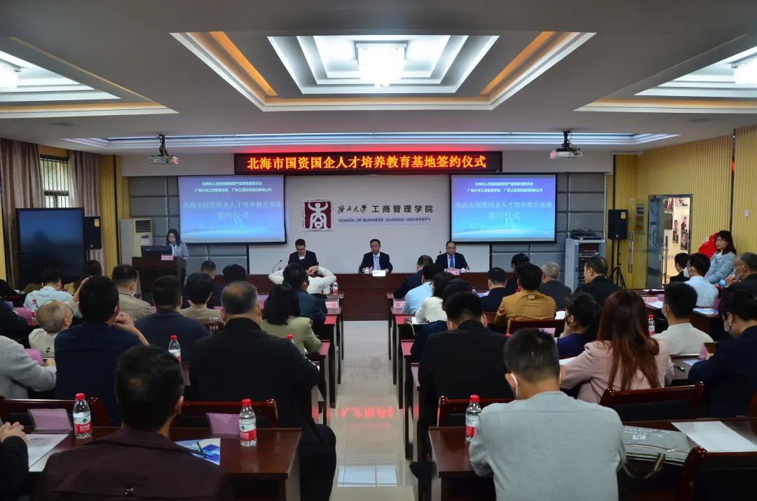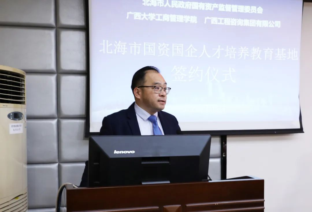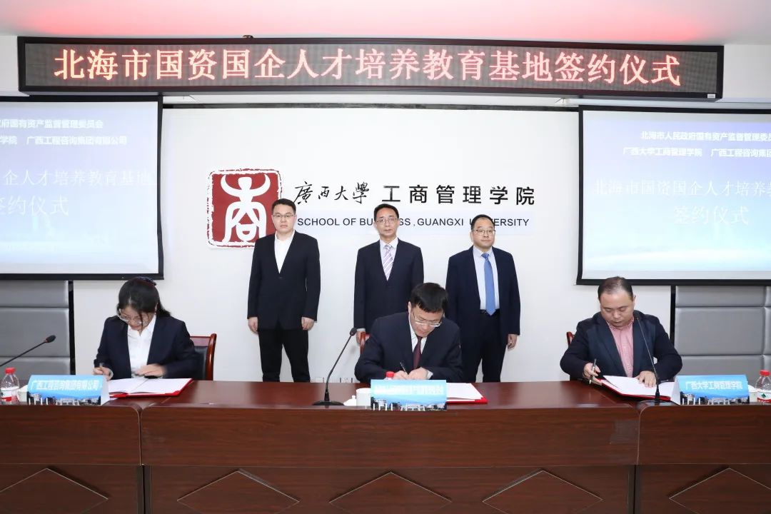 北海市国资委副主任农启智,mg冰球突破试玩副院长刘民坤,广西工程咨询集团有限公司党委副书记左俊兰作为签约代表签署《北海市国资国企人才培养教育基地共建合作框架协议书》。
