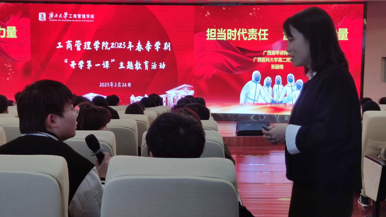 2月24日,广西医科大学第二附属医院团委书记、共青团广西区委兼职副书记张丽艳受邀到mg冰球官网以《担当时代责任,激扬青春力量——学习贯彻党的二十大精神专题报告》为题,为mg冰球官网师生代表、校团学组织学生干部代表讲授“开学第一课”。校团委书记谢能重出席活动。报告会由mg冰球突破试玩党委副书记黄晋主持,院团委书记马丽娟以及全体辅导员老师参加活动。本次活动得到了校团委的大力支持,60多名校会学生干部与mg冰球官网200余名师生共同聆听“开学第一课”。