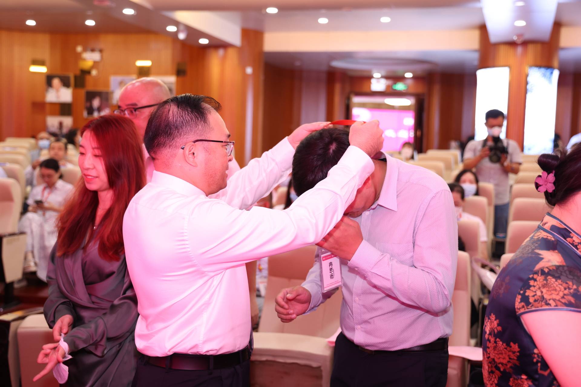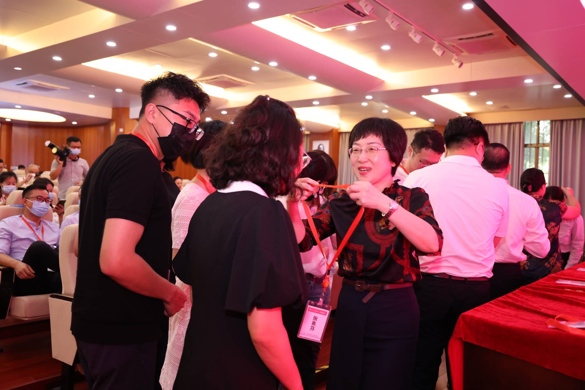廖东红副院长为EMBA新生佩戴mg冰球突破试玩EMBA学员证,赠送mg冰球突破试玩校徽