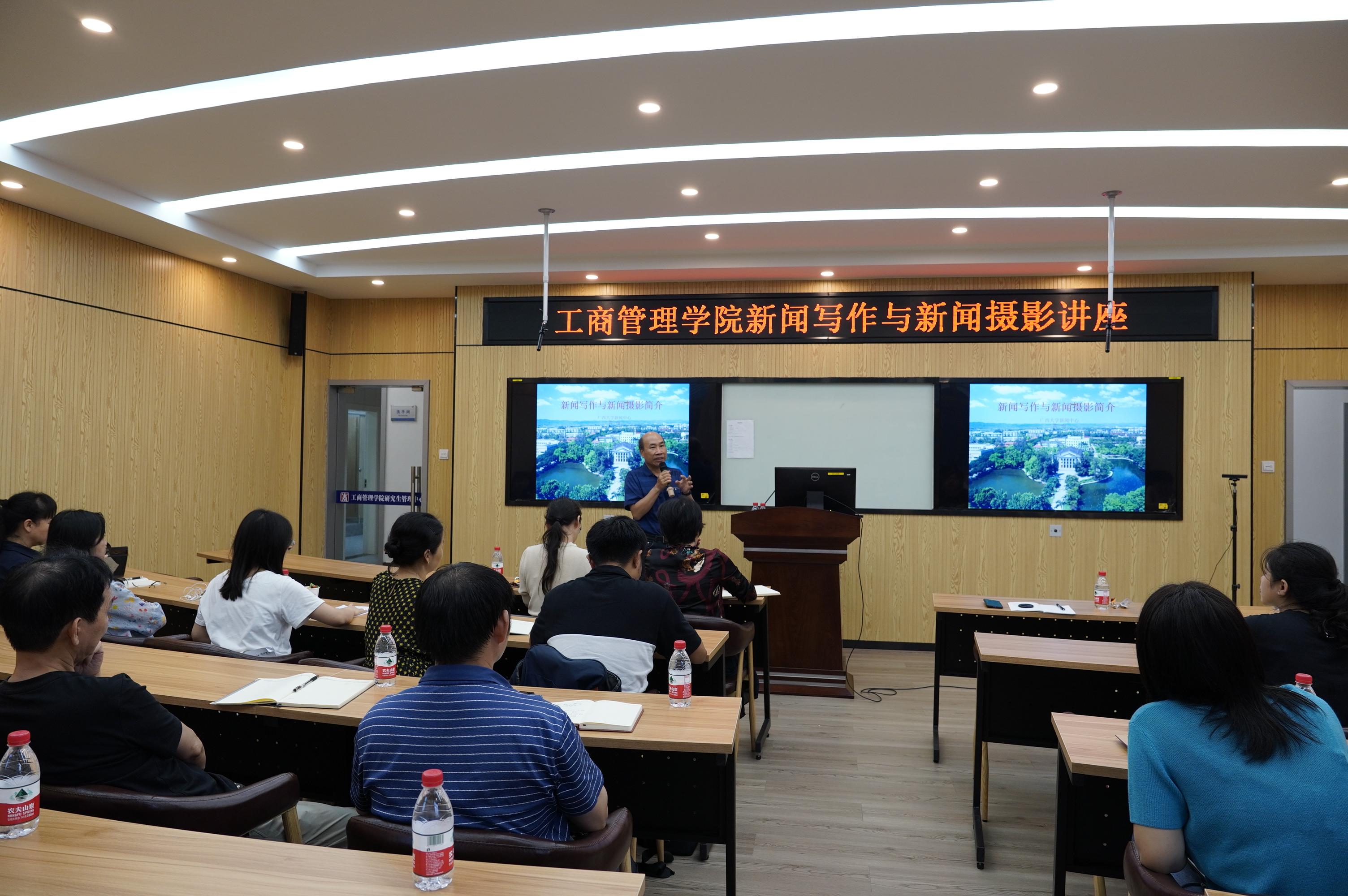 为进一步提升学院行政人员的综合素质,规范新闻写作和新闻摄影,加强宣传队伍建设,5月26日晚上,mg冰球官网邀请学校宣传部新闻中心六级职员、中国新闻摄影学会会员黄南老师在509B教室作题为“如何做好新闻写作与摄影”的讲座。讲座由学院党政办主任杨阳主持,副院长廖东红、全体行政人员和部分学生参加此次活动。
