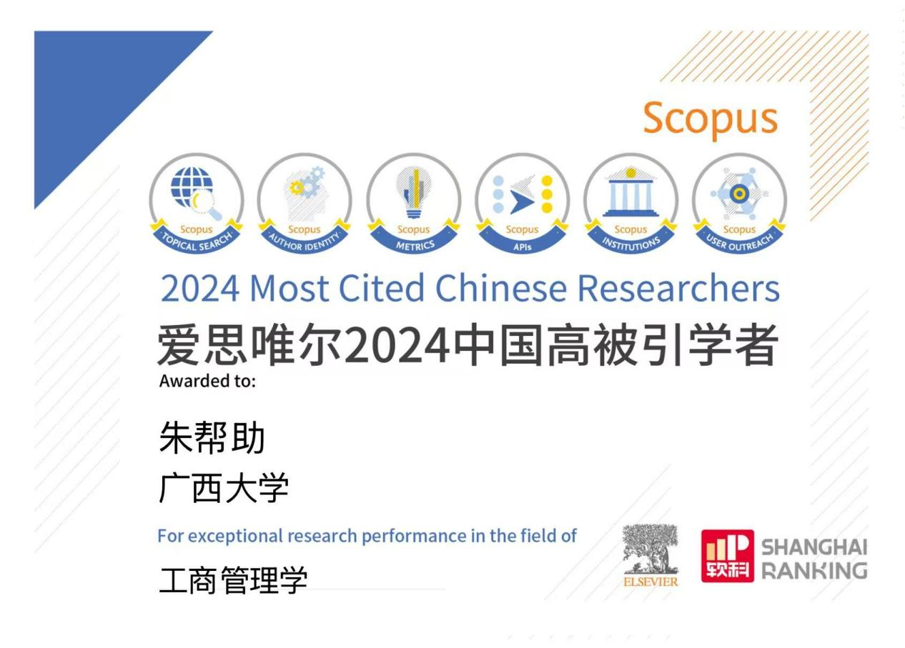 朱帮助教授自2021年以来连续4年入选“中国高被引学者”榜单,这对推动我校工商管理学科发展、扩大学校全球影响力有着积极影响。未来,mg冰球突破试玩将继续聚焦于国家战略需求和区域发展需求,开展创新性研究,进一步服务国家战略和广西经济社会发展,助力推进学校“双一流”建设和部区合建,不断提升科技创新和人才培养能力。