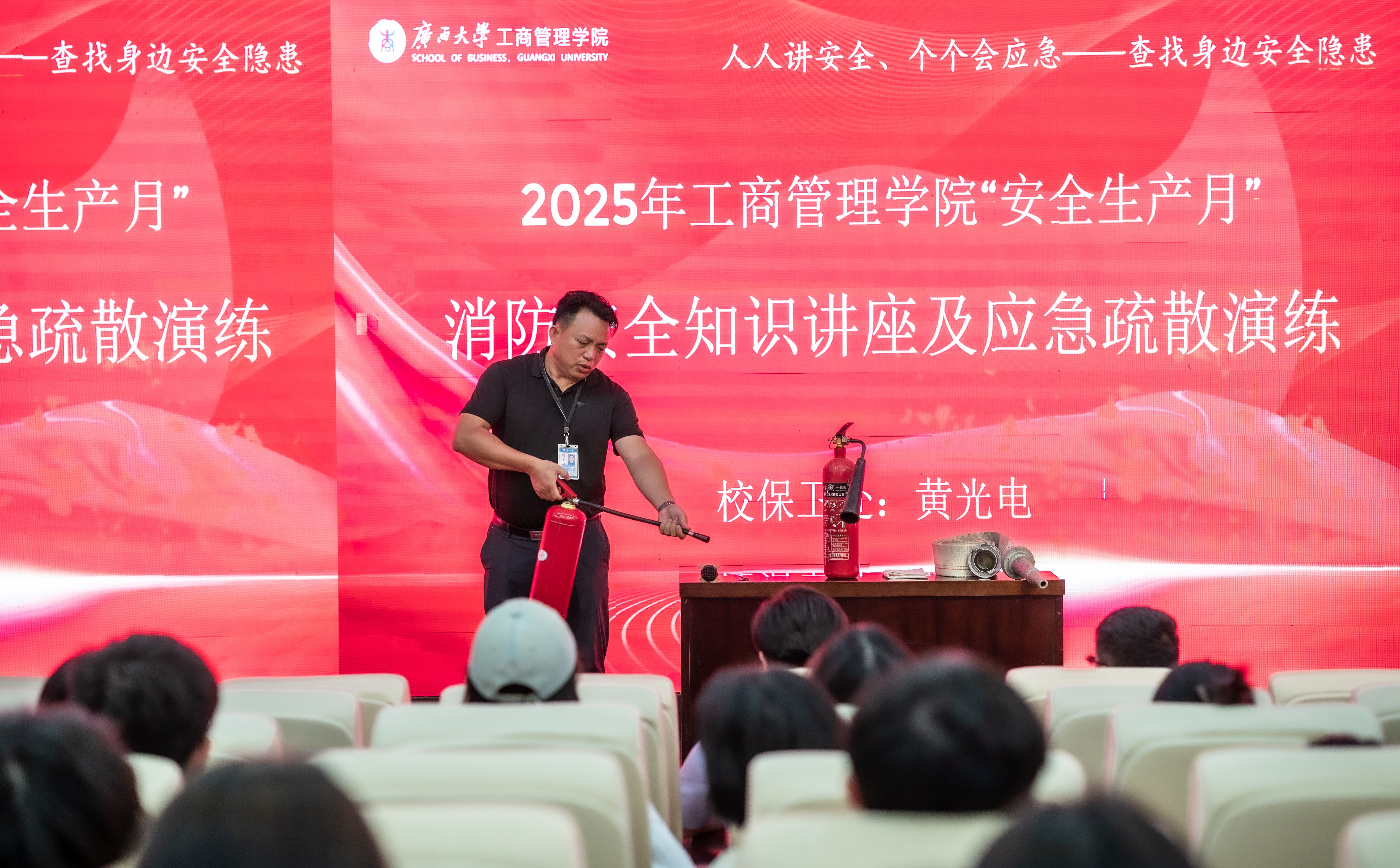 黄光电开展消防安全讲座,详细讲解了火灾预防、应急逃生要领及消防器材使用等知识,并结合近年来经历的消防事故案例和高校教育教学环境进行了重点预防提醒。在讲解消防器材使用时,黄光电详细介绍了灭火器的种类、适用范围及使用方法,并现场演示了如何正确使用灭火器扑灭初期火灾。