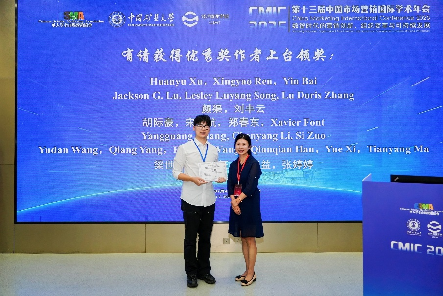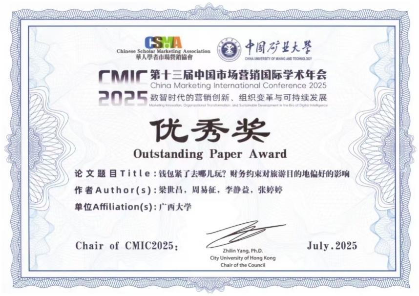 7月4日至7日,第十三届中国市场营销国际学术年会(CMIC2025)在中国矿业大学召开。由mg冰球官网梁世昌副教授指导,2023级硕士研究生周易征、2022级硕士研究生李静益和张婷婷合作完成的论文《钱包紧了去哪儿玩?财务约束对旅游目的地偏好的影响》荣获“优秀奖”。