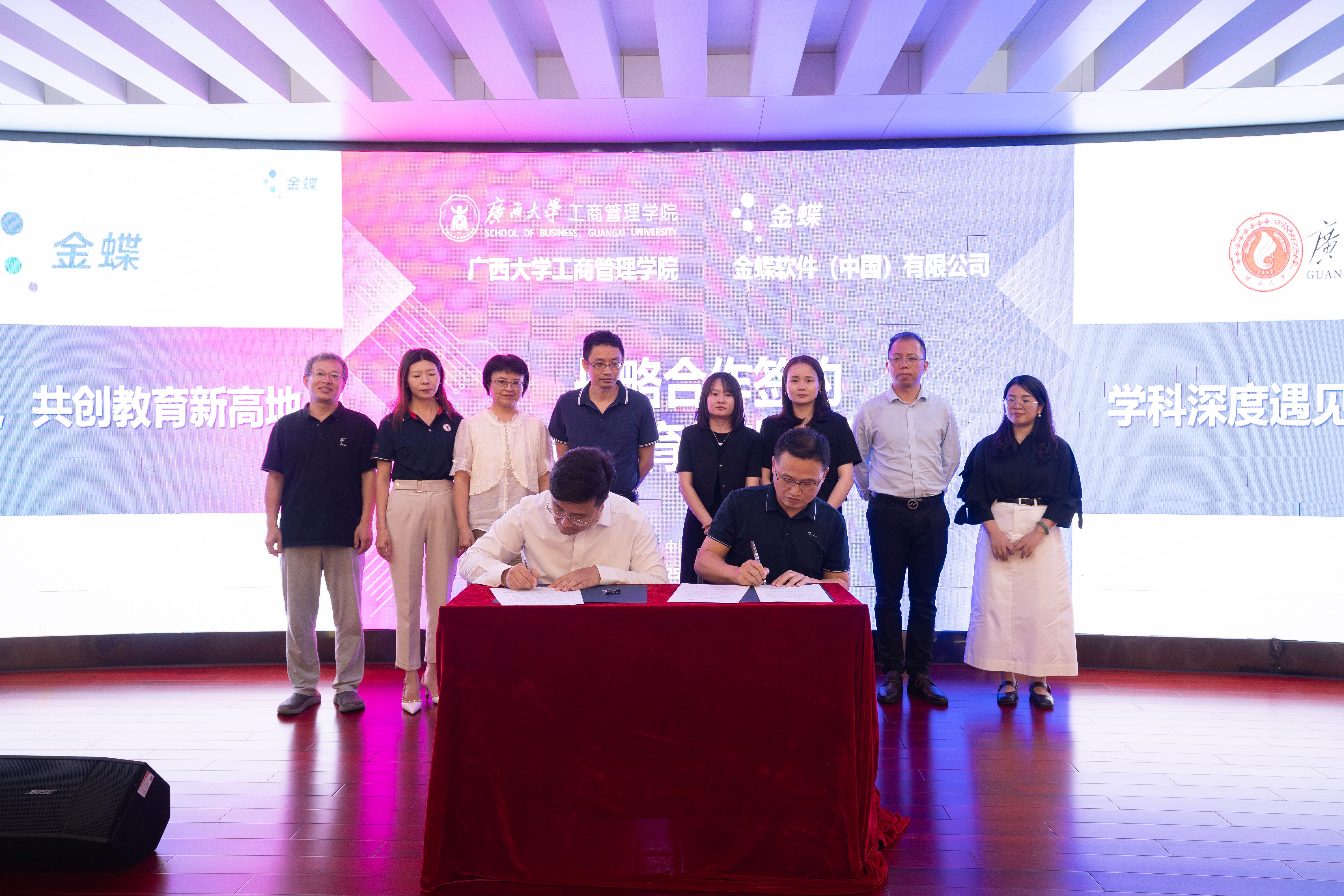 金蝶广西分公司市场部总监游阳、解决方案部高级顾问邓旭、院校业务经理韦晓春,mg冰球突破试玩党委办主任、团委书记马丽娟,会计与财务金融系师生代表80余人参加了仪式。