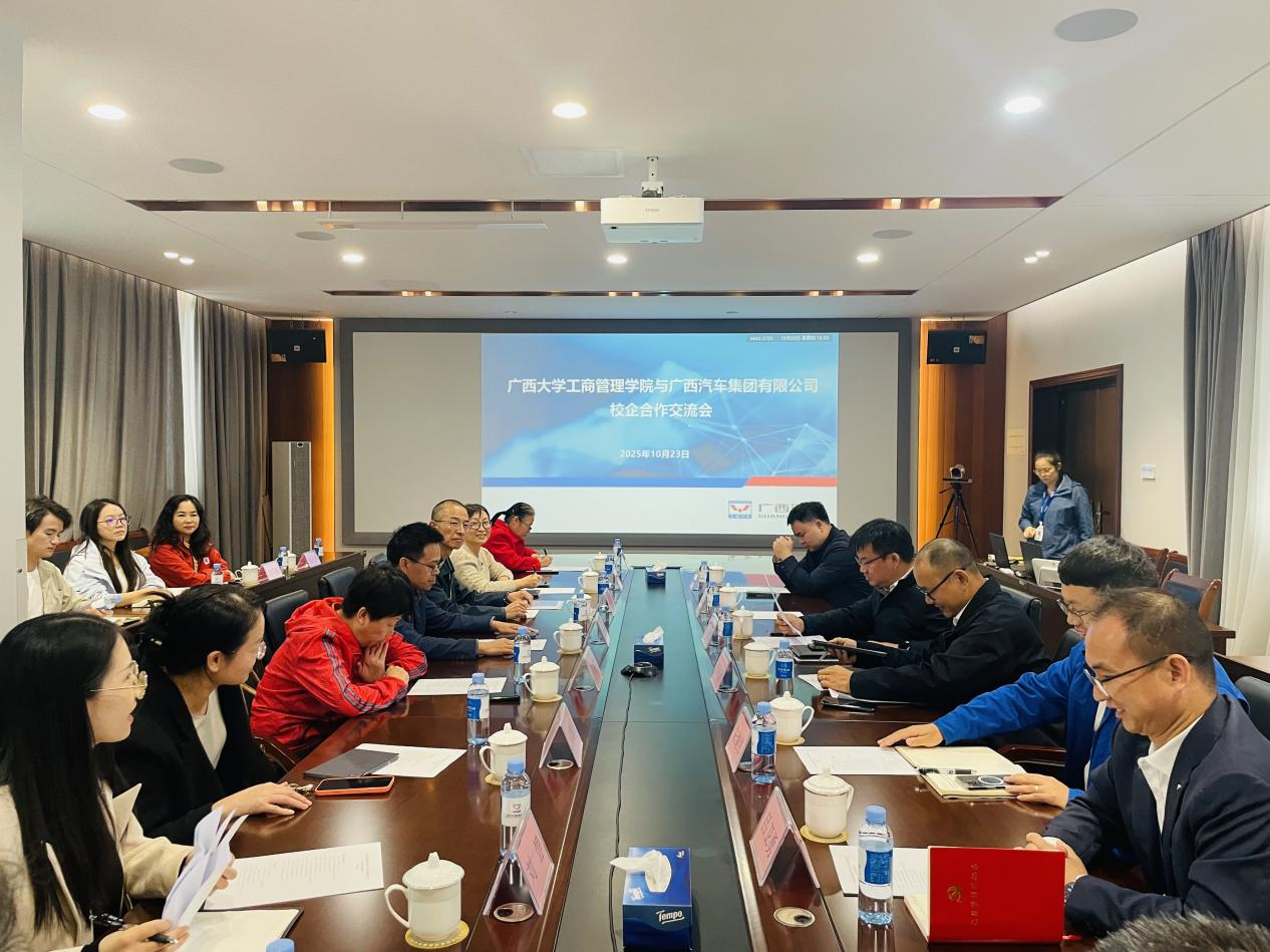 在广西汽车集团,调研组参观了总部展厅并举行校企合作座谈。座谈会由集团党委组织部部长李钦德主持,他介绍了企业人才培养战略及产业绿色发展政策,企业代表则详细解读了碳中和实施路径与碳排放管理实践。学院校友工作与政企服务办公室主任覃朝勇介绍了mg冰球官网学科建设进展,希望推动双方在人才培养、“双碳”研究等领域深度合作。交流环节中,mg冰球官网教师代表分别就国际市场战略、绿色财务、智能驾驶应用及创新体系建设提问。集团相关负责人、学院杰出校友结合学术与实践经验,系统解读了集团2016年以来的创新布局与成效,为师生理解制造业创新提供了生动范例。