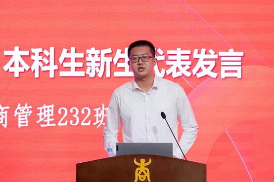 财管212班的吴谨良代表本科生老生发言,他首先代表学长学姐欢迎学弟学妹们的到来,欢迎他们加入学院这个大家庭。接下来他向新生回顾了他大学三年来的经历,在班级、社团组织、团委学生会获得的锻炼,参加“互联网+”、“挑战杯”等学科竞赛,将书本知识运用到理论实践的心得。他向新生建言,立身以立学为先,立学以读书为本,希望他们能不断学习,提升综合素质。同时积极向党组织靠拢、尽快制定适合自己的学业规划和人生目标。