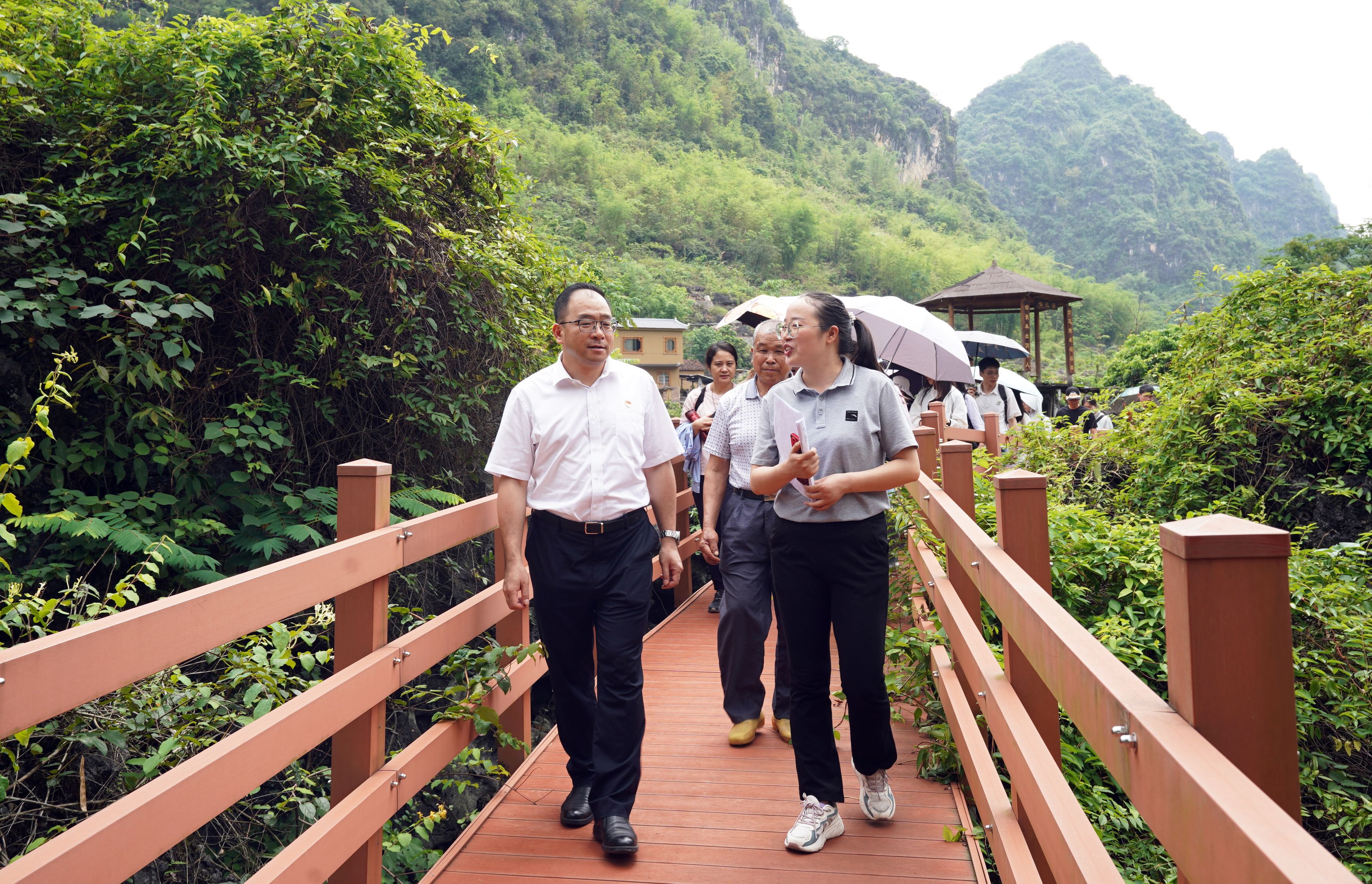 当天,师生党员们还实地调研了当地特色产业,参观了古寨瑶族乡民族团结成就展。在马山县荣艳生态种养合作社,师生们考察了佛手瓜苗产业基地。在古寨瑶族乡本立金银花产业示范区,古寨瑶族乡创建民族团结进步示范户潘国臣向大家详细介绍了金银花产业的发展历程、种植技术、种植环境、加工工艺、市场销售等方面情况。