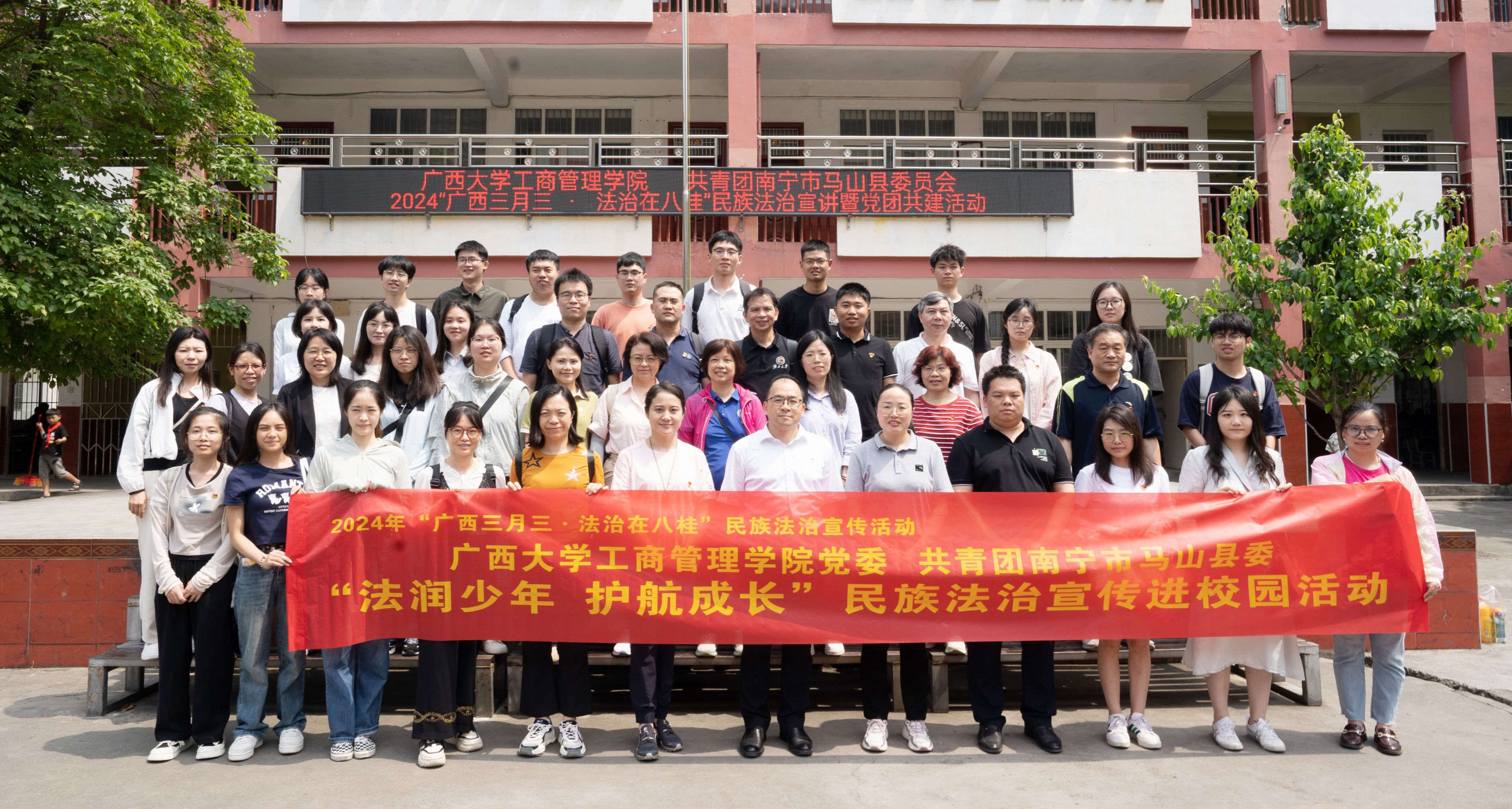 为深入贯彻落实习近平法治思想和习近平总书记对广西重大方略要求,4月26日,mg冰球突破试玩党委联合共青团南宁市马山县委员会开展“广西三月三·法治在八桂”民族法治宣传暨党团共建活动。mg冰球突破试玩党委书记罗诚、副院长申韬,马山团县委书记马玉花、马山县古寨瑶族乡党委书记陆家宝与mg冰球突破试玩教工财会党支部、旅管党支部、行政党支部和研究生第二党支部的师生党员代表参加了活动。