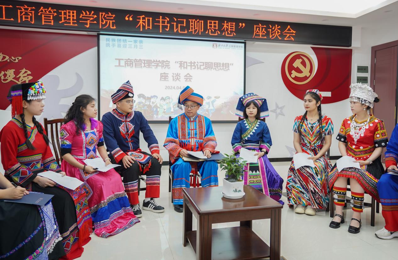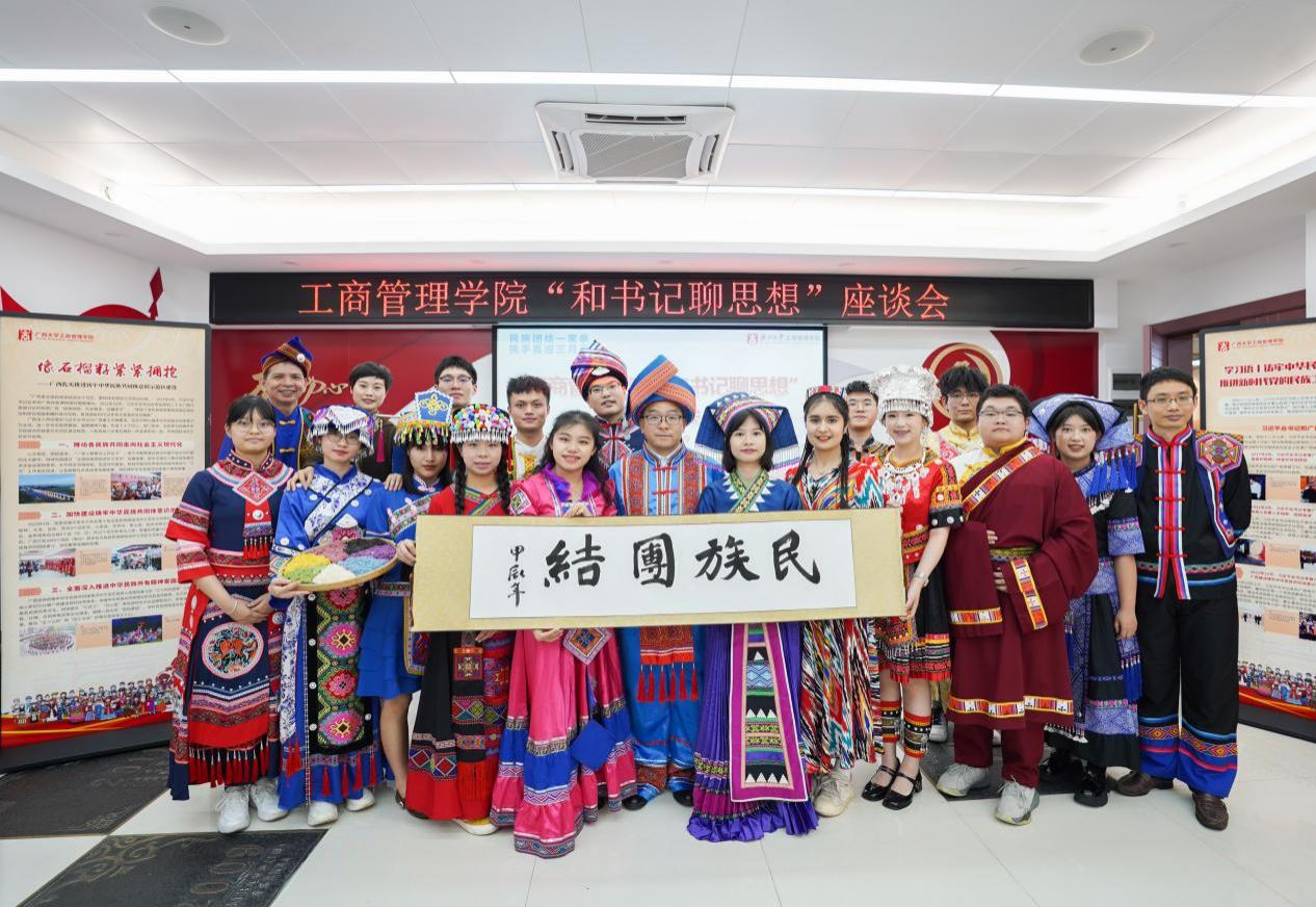喜迎广西三月三,共绘民族团结同心圆。4月9日下午,mg冰球官网在党员活动室举行各族学生代表“和书记聊思想”座谈会,学院党委书记罗诚身着民族服装与壮族、汉族、仫佬族、苗族、瑶族、维吾尔族、纳西族、傣族、满族等14名各族学生代表欢聚一堂,共庆佳节。学院党委副书记肖克宁,团委书记马丽娟、组织员黄照温、辅导员郁文丹参与座谈。
