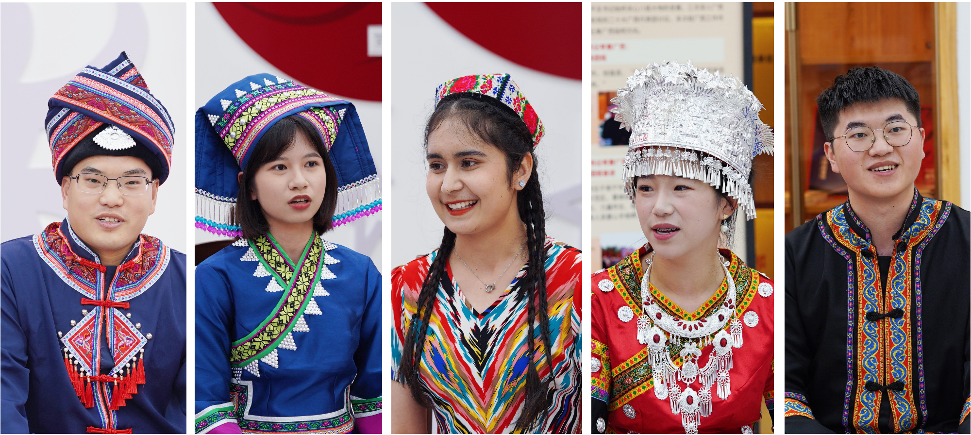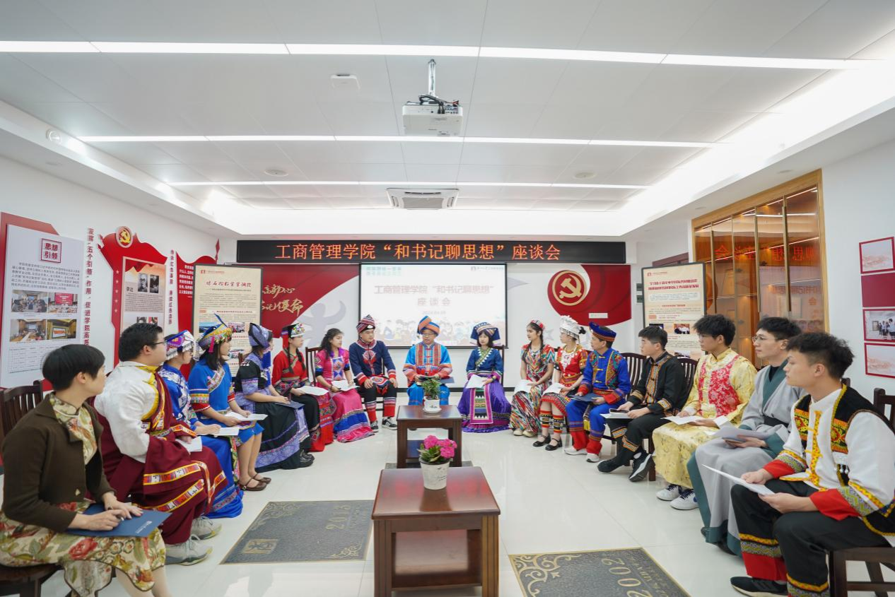 座谈会上,来自仫佬族的梁江雨同学、吴静妃同学,纳西族的万人杰同学、傣族的杨锦辉同学、苗族的何怡雪同学和维吾尔族的凯丽比努尔同学结合自身在少数民族预科班、民族班的求学经历,讲述了各民族学生之间交往交流交融的故事,言谈中不时流露出对党和国家加快培养少数民族地区人才特殊政策措施的感恩之情;来自汉族的梁耀升同学、彭薇雨同学分享了发生在身边的民族团结一家亲、和谐发展心连心的故事,让大家深刻体会到了中华民族一家亲、同心共筑中国梦的时代意义。在聊思想、谈感受的同时,梁江雨同学和吴静妃同学跟大家分享了仫佬族的服饰风俗,饮食风俗,居住风俗等,让大家记住了精致独特的仫佬族服饰和文化;杨焜同学从苗族地理分布、文化习俗、苗族跳坡节进行分享,并唱起山歌抒发了对党的感激之情!凯丽比努尔同学详细跟老师同学们讲解了维吾尔族名字的由来,分享了维吾尔族的节日盛况,并现场跳起新疆舞……各族学生代表畅所欲言,畅谈了自己来到大学适应地区气候、融入大学生活的情况和对未来的设想规划等,并结合自身体会,讲述了在党的民族政策下,感受到的党和国家对少数民族学生的关心与关爱。