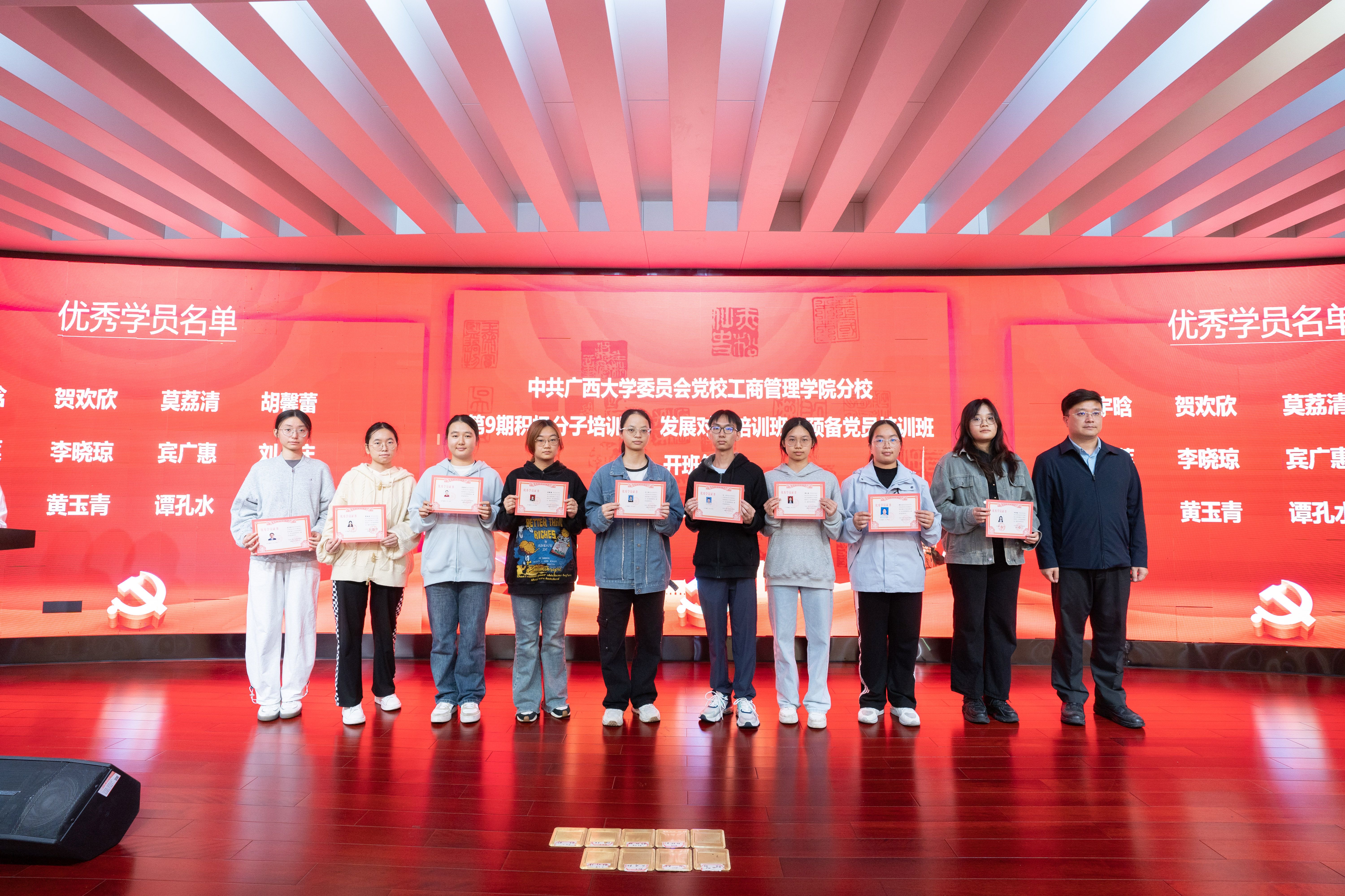 随后,黄晋为上一期党校班的优秀学员代表颁发荣誉证书并合影留念。党建秘书处代表向大家详细介绍了本期党校班的教学计划与纪律要求。