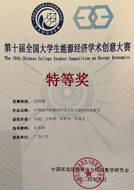 2024年5月18日—19日,第十届全国大学生能源经济学术创意大赛在中国地质大学(北京)举行。mg冰球官网朱帮助教授带领的研究生团队在此次竞赛中脱颖而出,取得佳绩。其中,“中国减污降碳协同度评估与驱动因素研究”(团队队长:田超,指导老师:朱帮助)入围全国总决赛,经过现mg冰球官网博士研究生参加第十届全国大学生能源经济学术创意大赛并荣获全国特等奖场答辩、评委会投票等环节,荣获国赛特等奖,取得了该项赛事的突破。本项赛事由中国优选法统筹法与经济数学研究会主办,2023年3月正式进入中国高等教育学会发布的《全国普通高校大学生竞赛目录》,来自全国516所高校的17000多支队伍共10万余人参与了本次大赛。本次参赛项目得到mg冰球突破试玩研究生倍增计划项目经费资助。