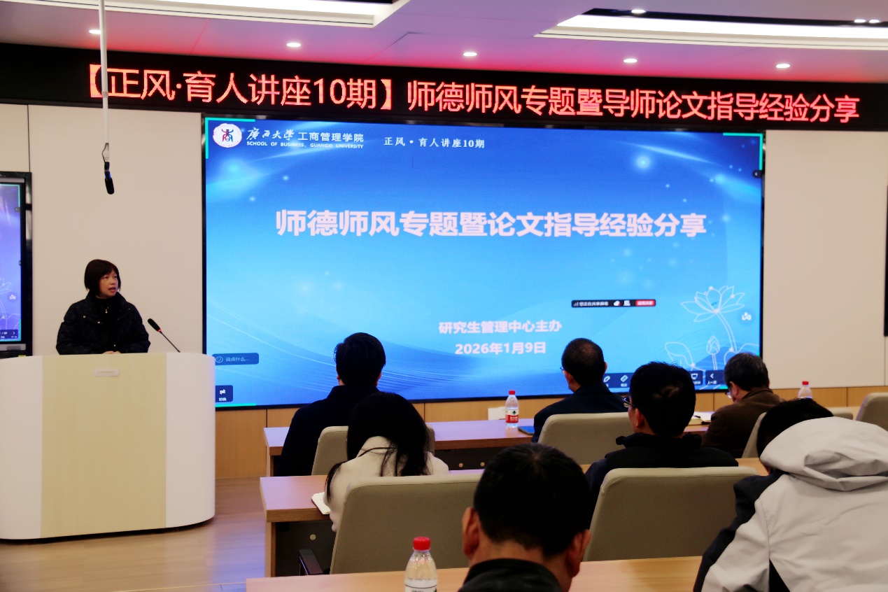 1月9日下午,由学院研究生管理中心主办的研究生导师师德师风专题教育暨论文指导经验分享会在122教室成功举办。学院党委书记黄晋、研究生院副院长朱少英、学院副院长韦铁、旅游管理系主任郭峦以及学院全体研究生导师参加培训,会议由研究生管理中心主任叶映主持。