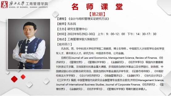 2022年9月29日到30日,mg冰球官网邀请华中科技大学经济学院二级教授、博士生导师孔东明到校讲授《会计与组织管理实证研究方法》。孔教授以“实证研究中的因果识别”为主题,在mg冰球突破试玩128报告厅为mg冰球官网师生带来了一场别开生面的实证研究方法课堂。