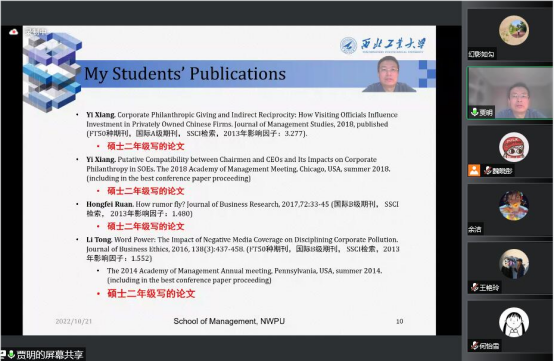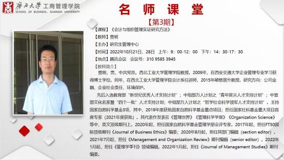 西北工业大学管理学院贾明教授应邀分别于2022年10月21日、10月28日为mg冰球官网2022级硕博研究生和其他师生进行为期2天的《会计与组织管理实证研究方法》系列课程授课。此次课程以《管理研究的思维方式》为主题,主要通过“腾讯会议”以学术讲座形式在线上开展。