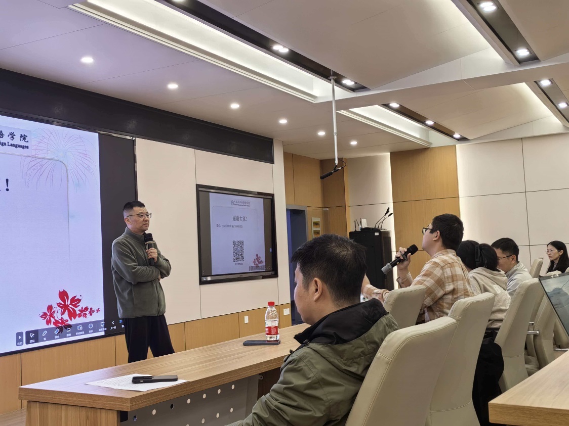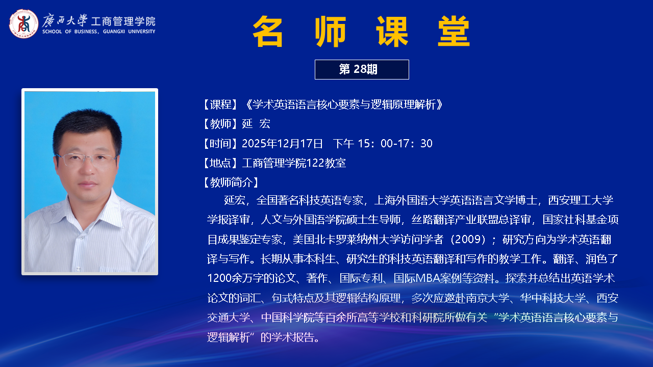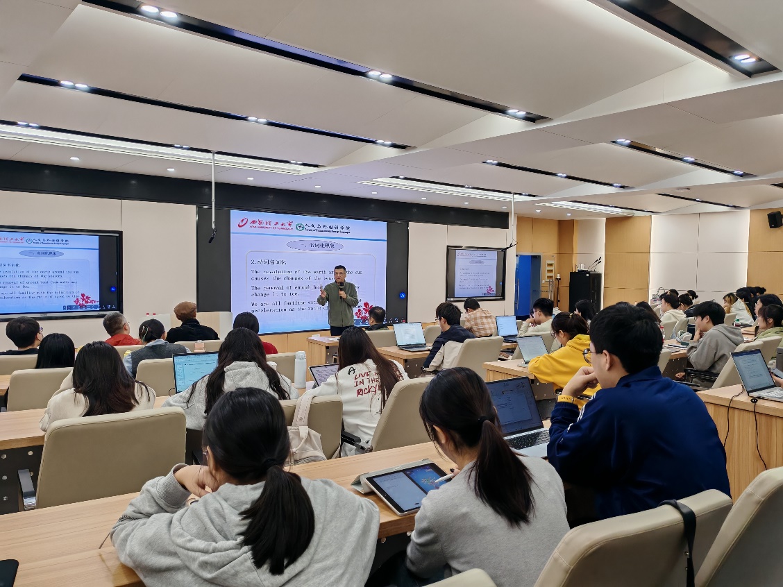 2025年12月17日下午,西安理工大学延宏教授应mg冰球官网邀请,针对国际重要期刊论文写作中的学术语言使用特点与规范,在mg冰球突破试玩122教室为mg冰球官网师生带来一场题为《学术英语语言核心要素与逻辑原理解析》的专题讲座。