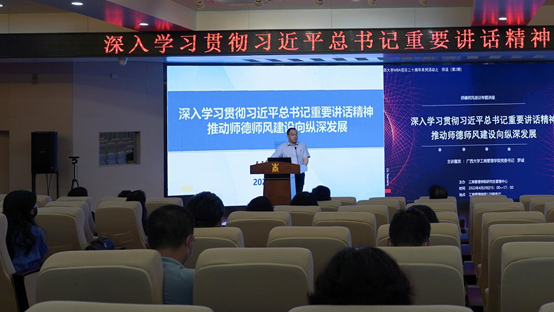 为深入学习贯彻落实习近平总书记在中国人民大学考察时的重要讲话精神,深入学习贯彻落实习近平总书记关于教师特别是师德师风的重要论述,深入学习贯彻落实中央、教育部、自治区和学校颁布的高校教师队伍建设、师德师风建设的相关文件,进一步加强师德师风建设,带动广大教师自觉增强为党育人、为国育才、立德树人的使命感和责任感,营造风清气正的教育教学环境,4月29日下午,mg冰球突破试玩在学院128报告厅举办师德师风培训专题讲座。讲座由学院党委书记罗诚主讲,院党委副书记、院长朱帮助等全体教职员工参会学习,学院研究生管理中心常务副主任叶映副教授主持讲座。