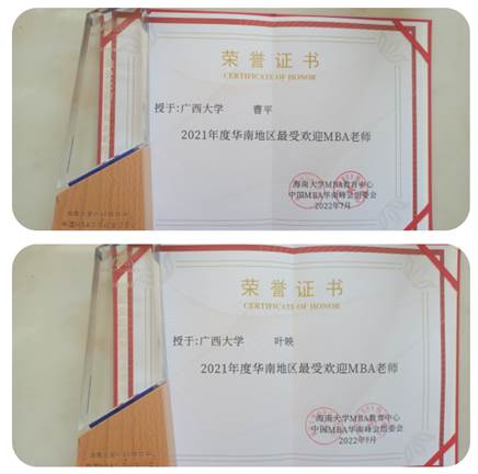 曹平教授、叶映副教授荣获“2021年度华南地区最受欢迎MBA老师”此项殊荣。这既是荣誉也是责任,在今后的日子里希望两位老师不忘初心,以德身教,以书育人,继续投身MBA教育事业,不断提高MBA教学质量。
