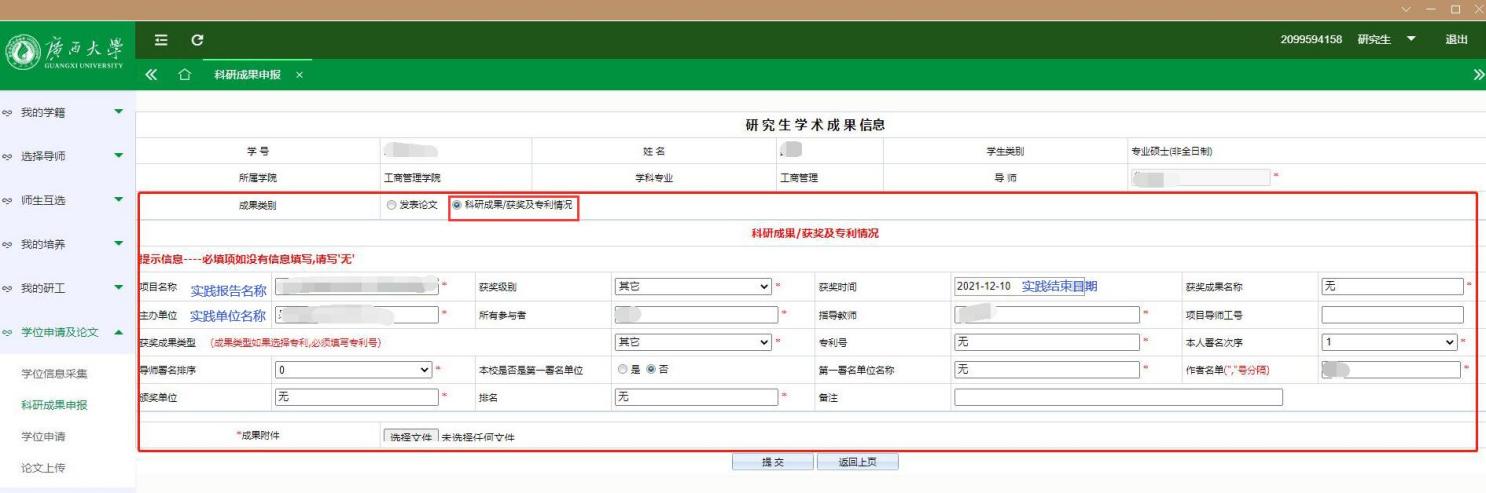 每位同学都以6000字实践报告代替科研成果上传系统,上传填写如下图: