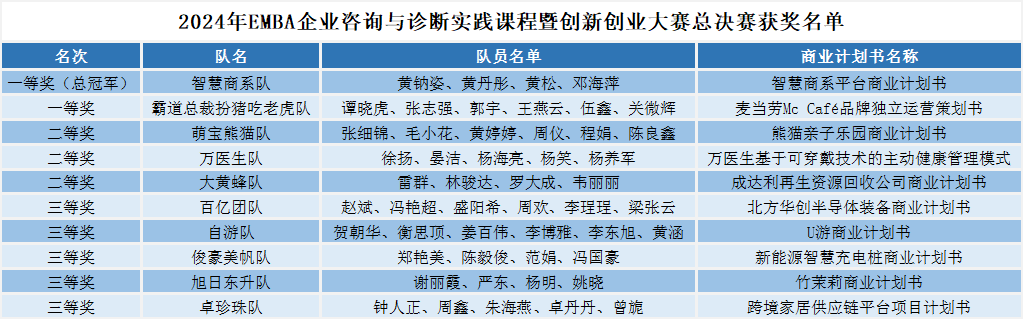 11月21日晚,经过近4个小时激烈而精彩的角逐,mg冰球突破试玩2024年EMBA企业咨询与诊断实践课程暨创新创业大赛总决赛圆满落幕。2024级EMBA学生组成的32个小组,经过选拔赛的比拼,共有10支队伍脱颖而出,凭借总决赛的精彩表现,最终产生一等奖2名、二等奖3名、三等奖5名。