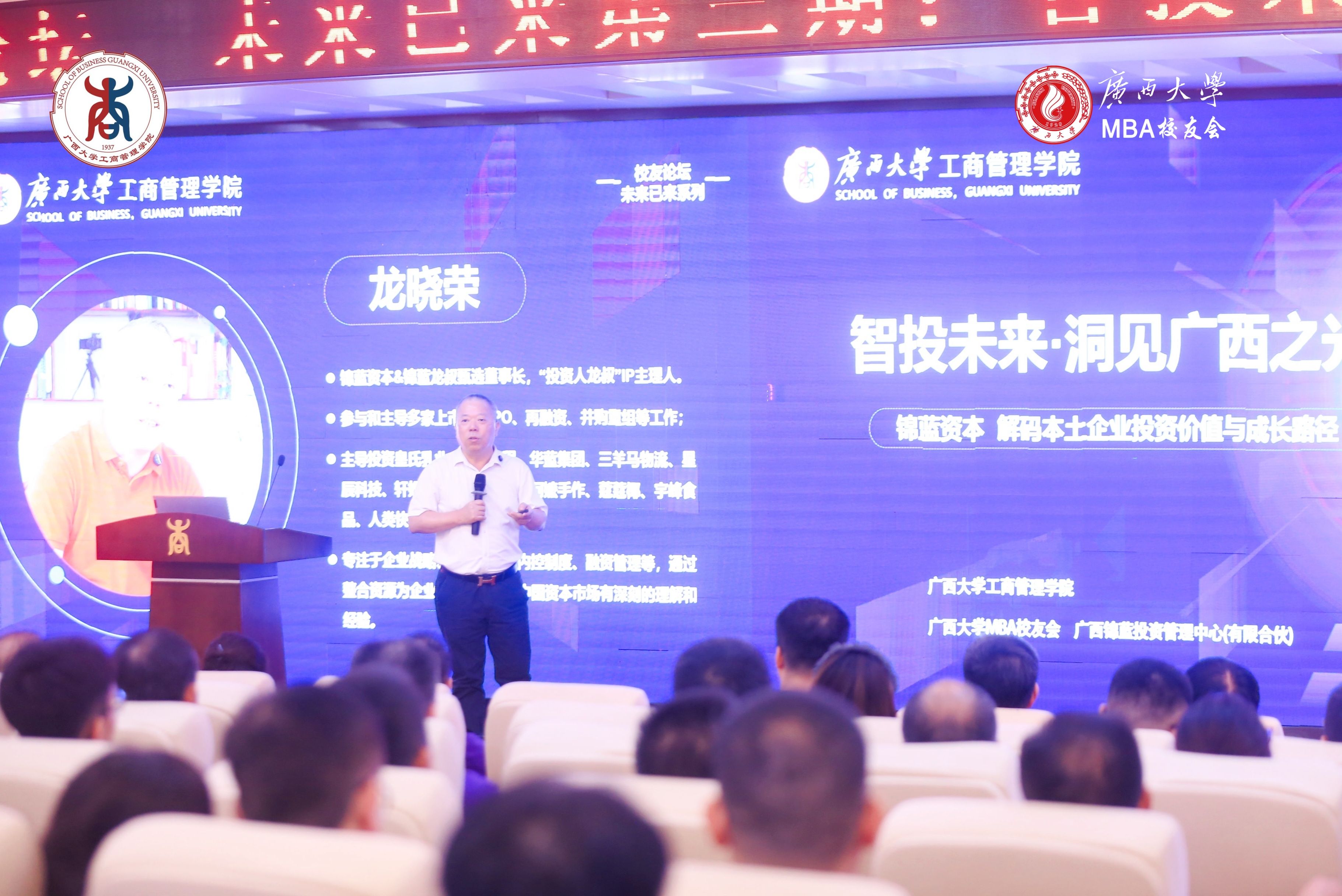 2025年9月21日下午,mg冰球突破试玩128报告厅内高朋满座、思想汇聚,一场聚焦资本赋能与广西产业发展的深度对话在此拉开帷幕。由mg冰球突破试玩与mg冰球突破试玩MBA校友会联合主办的“未来已来”校友论坛第三期——“智投未来・洞见广西之光”,特邀锦蓝资本创始人、“投资人龙叔”IP主理人龙晓荣先生担任主讲嘉宾,与学院师生及校友共探发展机遇。