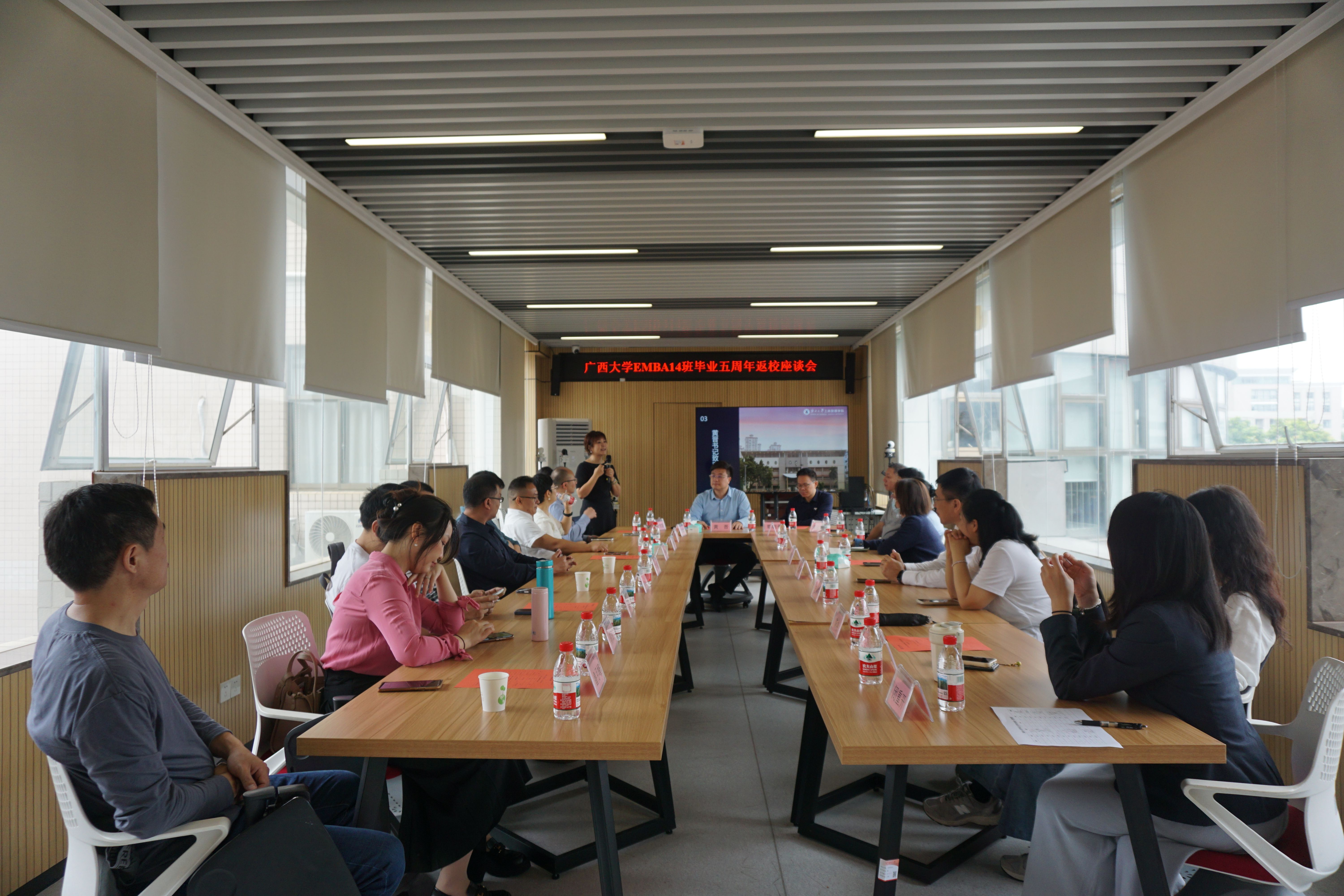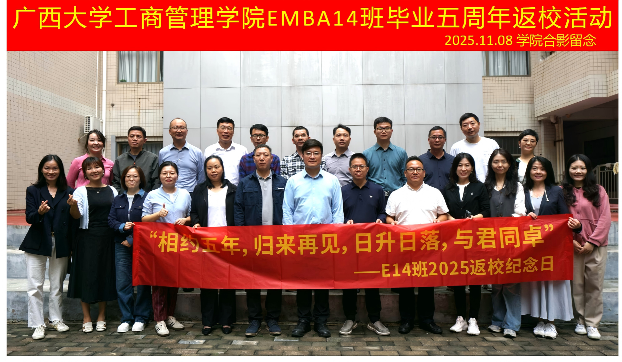 2025年11月8日上午,绿城南宁秋意正浓,mg冰球突破试玩迎来了一批特殊的“家人”—EMBA14班的校友们,在毕业五周年的重要时刻重返母校,共赴一场“重温同窗谊,再启新篇章”的温情聚会。二十余位校友跨越山海,从全国各地奔赴而来,相聚学院500教室,在熟悉的校园中追忆往昔,畅谈当下,共绘未来蓝图。