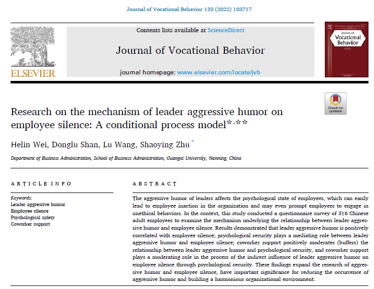 Wei H, Shan D, Wang L, Zhu, S*. Research on the mechanism of leader aggressive humor on employee silence: A conditional process model[J]. Journal of Vocational Behavior, 2022, 135: 103717.