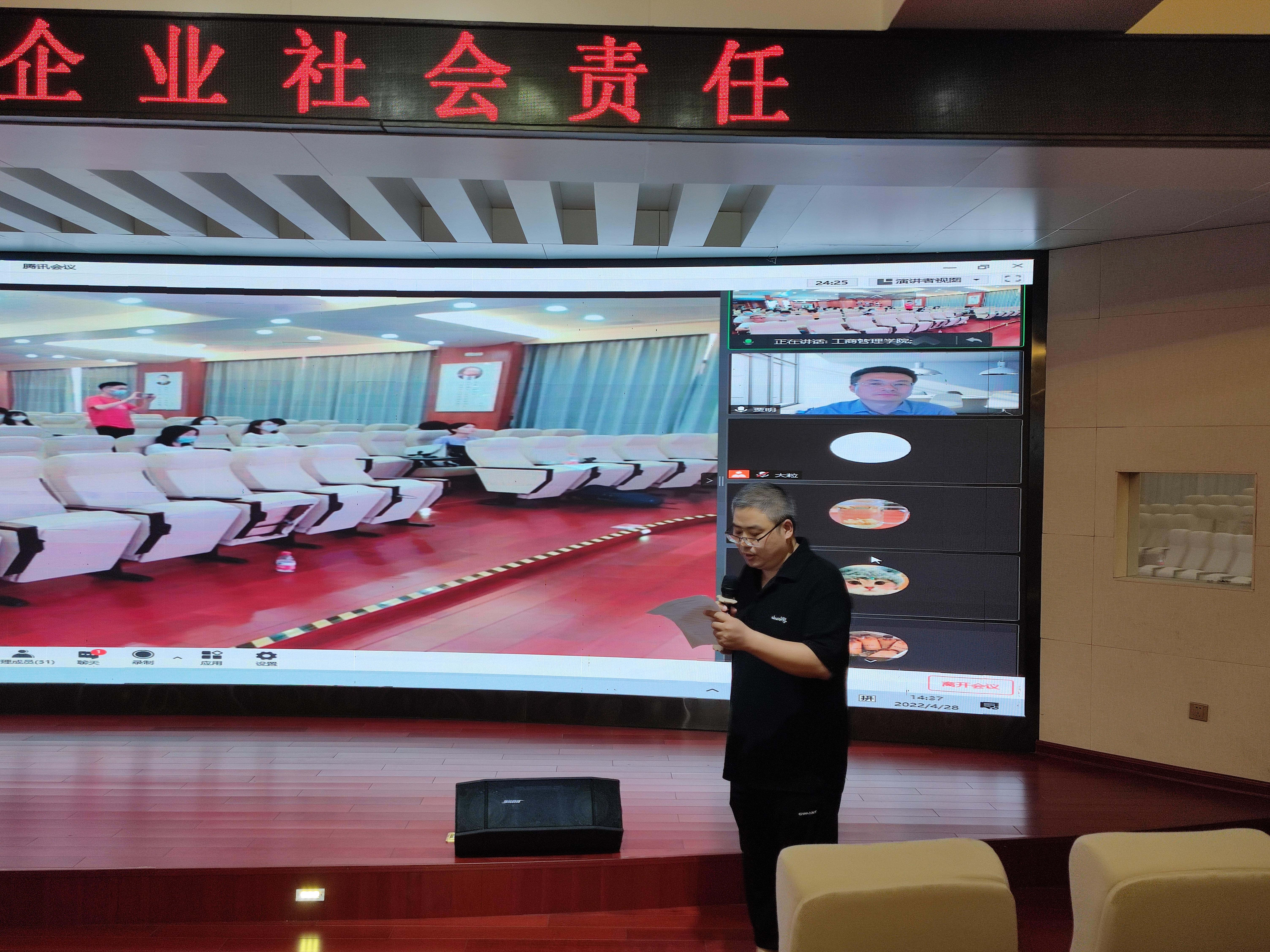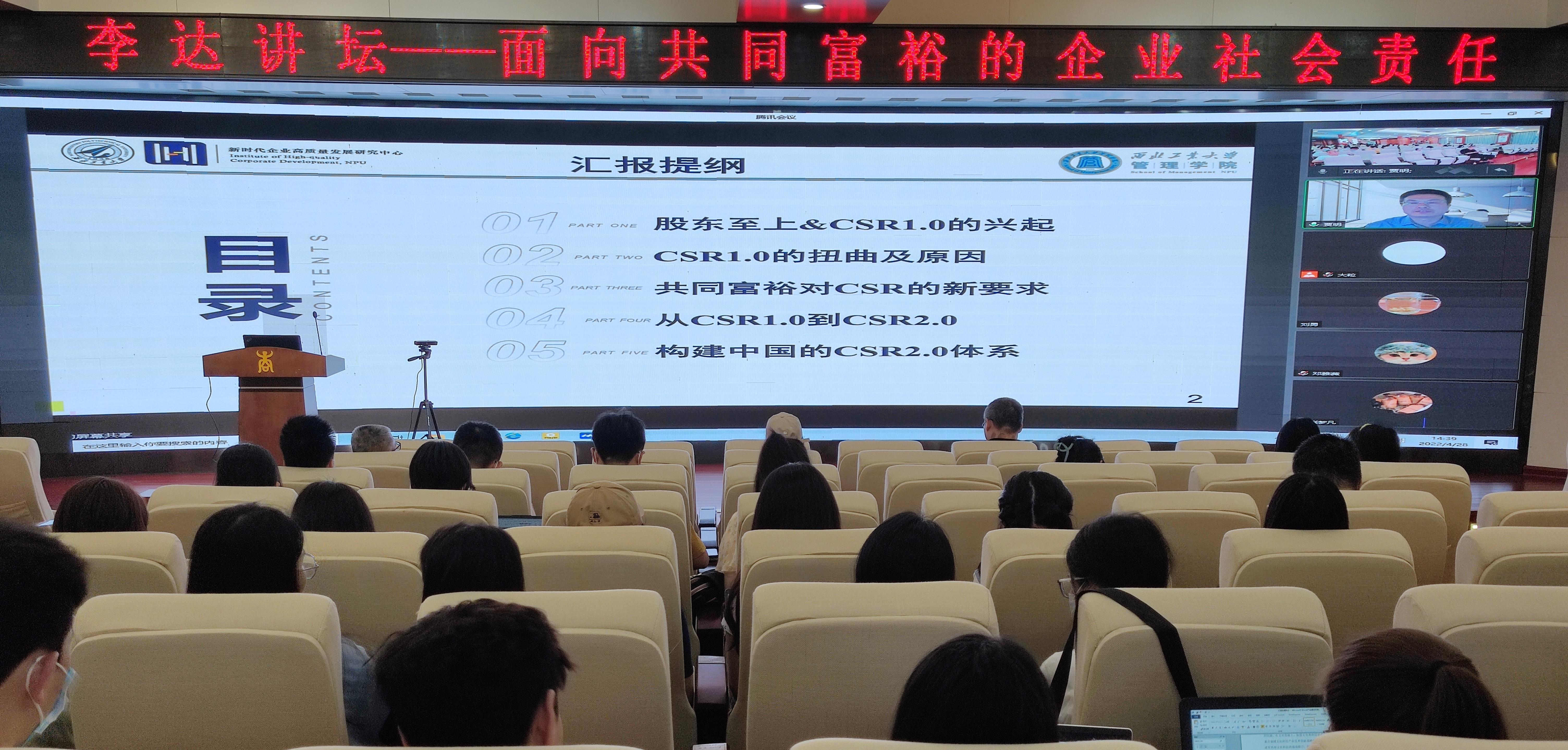 2022年4月28日下午,西北工业大学管理学院贾明教授应邀做客mg冰球官网第99期“李达讲坛”,带来题为“面向共同富裕的企业社会责任”的学术研究分享。讲坛在线上和线下同时进行,约120名师生参加。本次讲坛由mg冰球官网院长朱帮助教授主持。