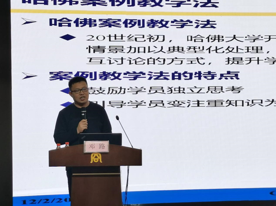 第三,案例教学课堂计划。邓教授分享了他案例教学课堂的具体计划安排,首先课前布置学员完成相关材料的阅读并对思考题进行初步思考,然后课中引导学员分组讨论、发言、辩论,最后教师进行案例总结并布置学员查找类似案例进行对比分析。