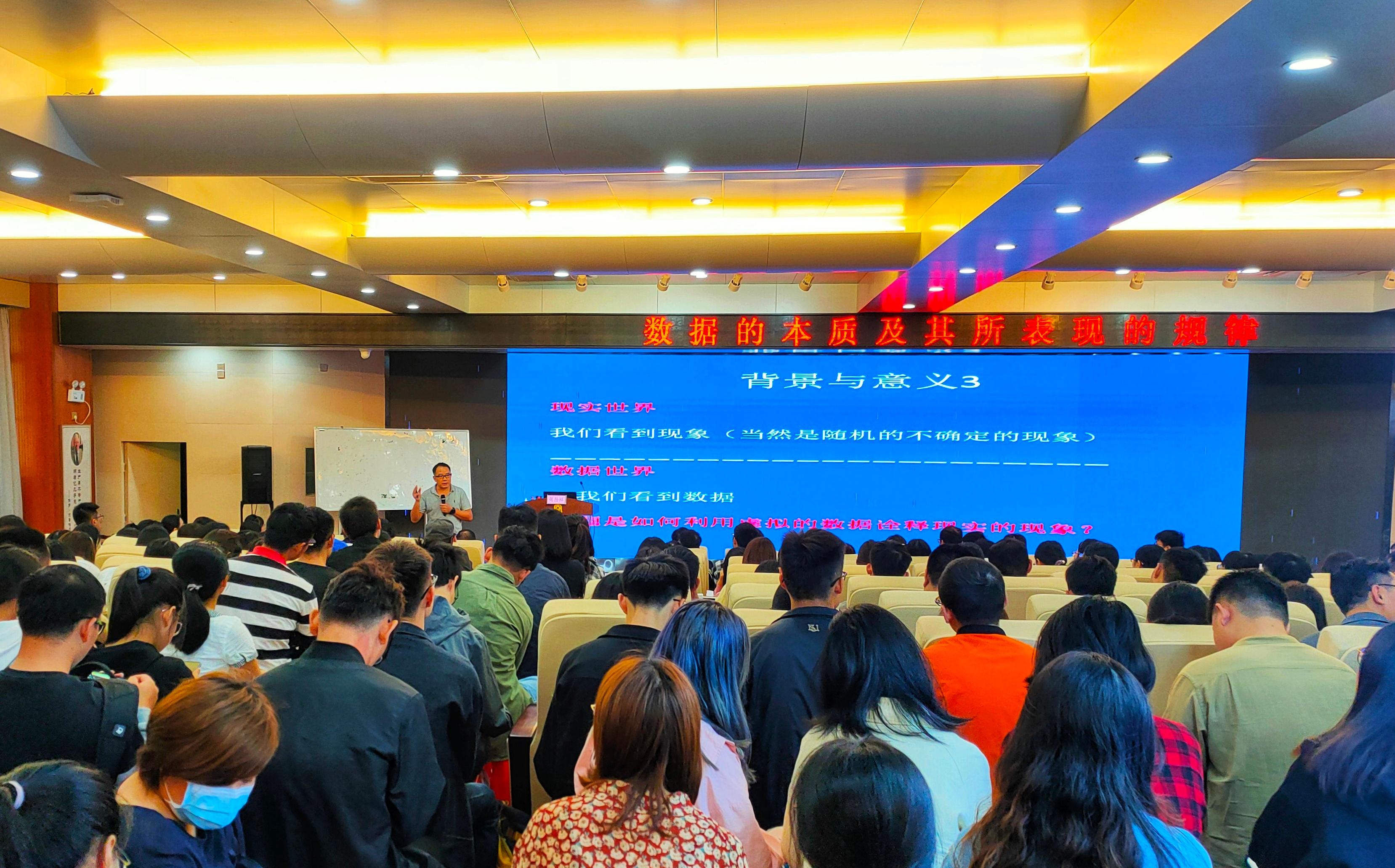 讲座内容主要分为四大部分。第一,发现现象到数据。在这一部分,蒋教授生动形象的给我们解释了现象、学科、科学三者之间的联系与区别。其中,蒋教授重点阐述了自然界和人类社会中两类不同现象,即决定性现象与随机现象。第二,大概率、小概率及其规律。蒋教授运用大量生活化的事例将大概率、小概率事件及其规律串联起来,并指导我们如何认识规律和运用规律。第三,从佛学的角度看待数据及规律。蒋教授运用佛学的公理为同学们深入浅出的解释了何为缘分、何为规律,并告之同学们应该如何将此原理运用到我们的生活和学习研究中。第四,从数据到现象的解释。蒋教授从易经出发,揭示了事物的一般属性,并运用中心极限定理对概率、统计进行再次定义。