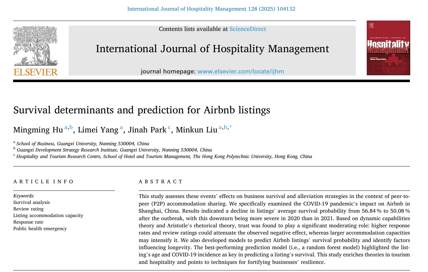 近日,mg冰球官网胡明明团队在共享民宿生存分析和预测领域研究取得新进展,研究成果以“Survival determinants and prediction for Airbnb listings”为题,在旅游管理国际高水平期刊《International Journal of Hospitality Management》上发表。论文的第一作者为mg冰球官网胡明明副教授,通讯作者为mg冰球官网刘民坤教授,mg冰球官网博士研究生杨丽梅在两位老师的指导下参与研究并共同发表论文,mg冰球突破试玩为第一单位和通讯单位。