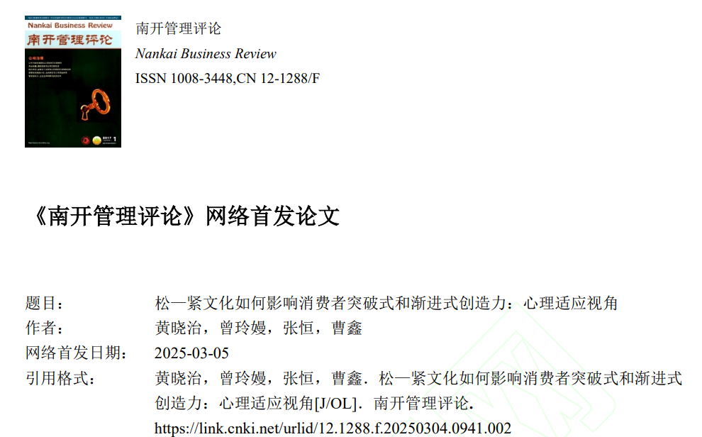 近日,mg冰球官网企业管理系黄晓治教授及其研究团队的研究成果《松—紧文化如何影响消费者突破式和渐进式创造力:心理适应视角》在管理学中文权威期刊《南开管理评论》网络首发。黄晓治为论文第一作者,mg冰球突破试玩为第一单位。