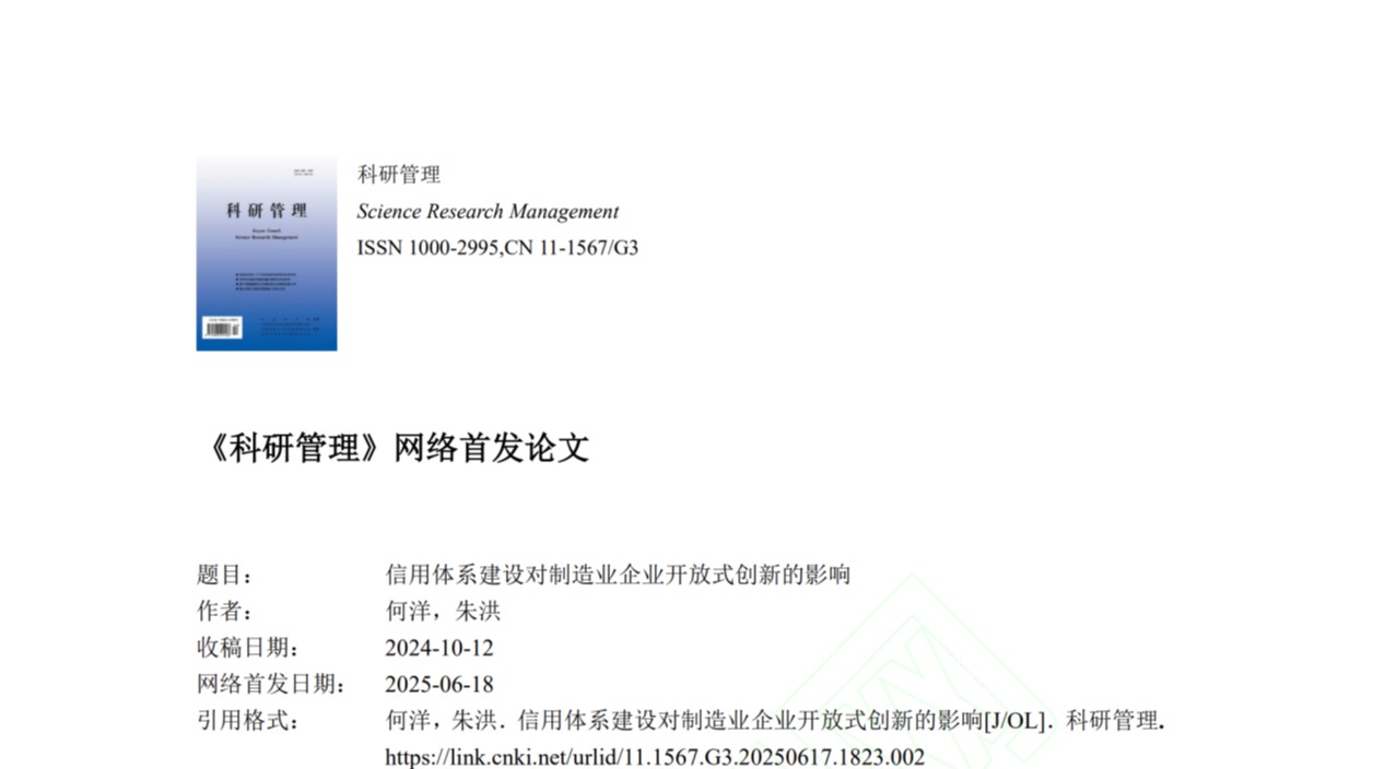 近日,mg冰球官网助理教授何洋、硕士研究生朱洪在信用制度建设与企业开放式创新领域研究取得新进展,研究成果《信用体系建设对制造业企业开放式创新的影响》在创新管理领域高水平期刊《科研管理》上网络首发。mg冰球官网助理教授何洋为第一和通讯作者,mg冰球突破试玩为第一单位。