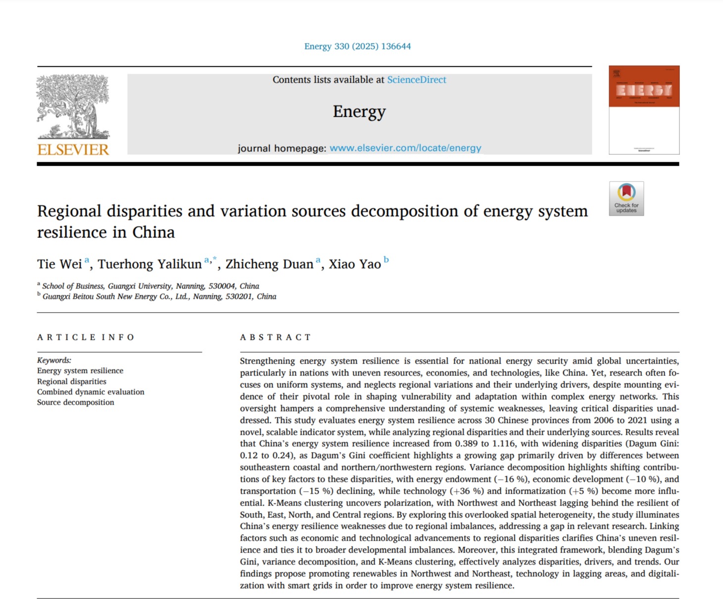 近日,mg冰球官网韦铁教授团队在我国能源系统领域研究取得重要进展,研究成果《Regional disparities and variation sources decomposition of energy system resilience in China》在能源领域国际权威期刊《Energy》上发表。mg冰球官网韦铁教授为论文第一作者,论文通讯作者为mg冰球官网硕士研究生亚力昆·吐尔洪,其他合作作者包括mg冰球官网博士研究生段至诚和EMBA学员、广西北投南新能源公司姚晓,mg冰球突破试玩为论文第一单位和通讯单位。