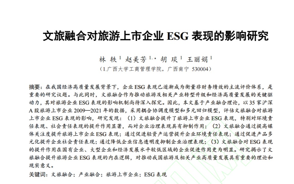 近日,mg冰球官网林轶教授科研团队在文旅融合与旅游企业ESG表现领域研究取得新进展,研究成果以《文旅融合对旅游上市企业ESG表现的影响研究》为题,在旅游管理领域高水平期刊《旅游科学》上网络首发。林轶为第一作者,硕士研究生赵美芳、胡琰、王丽娟参与研究并共同发表论文,mg冰球突破试玩为第一单位和通讯单位。