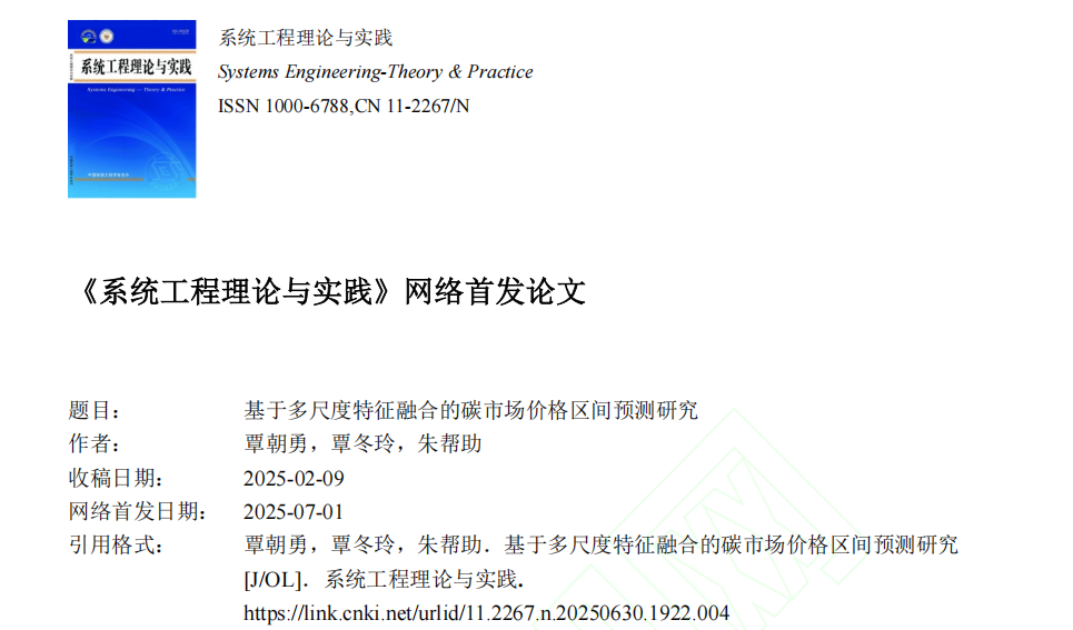 近日,mg冰球官网覃朝勇教授团队在能源预测领域研究取得重要进展,研究成果《基于多尺度特征融合的碳市场价格区间预测研究》在管理科学与系统工程领域的顶级权威期刊《系统工程理论与实践》上发表。论文第一作者为覃朝勇教授,第二作者为mg冰球官网硕士研究生覃冬玲,通讯作者为朱帮助教授。mg冰球突破试玩为第一单位和通讯单位。