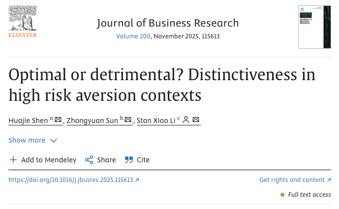 近日,mg冰球官网助理教授沈华杰与香港城市大学Stan Xiao Li教授、Zhongyuan Sun博士生在最优区分战略领域研究取得新进展,研究成果《Optimal or detrimental? Distinctiveness in high risk aversion contexts》在管理学高水平期刊《Journal of Business Research》网络首发。mg冰球官网助理教授沈华杰为第一作者,mg冰球突破试玩为第一单位。