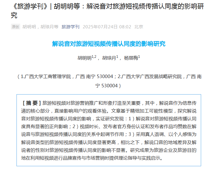 该研究以北京、广西两地抖音平台热度排行前列的4个5A级景区短视频为研究对象,基于精细加工可能性模型(ELM),系统探究解说音对旅游短视频传播认同度的影响及内在机制。研究明确了解说音对旅游短视频传播认同度的显著正向作用,揭示了视频时长、发布者官方身份认证、发布者作品均赞数在两者关系中的调节效应;该研究成果丰富了旅游短视频听觉元素影响机制研究,为旅游企业、旅游目的地通过短视频优化品牌宣传、提升营销效能提供了科学的理论依据与实践路径。