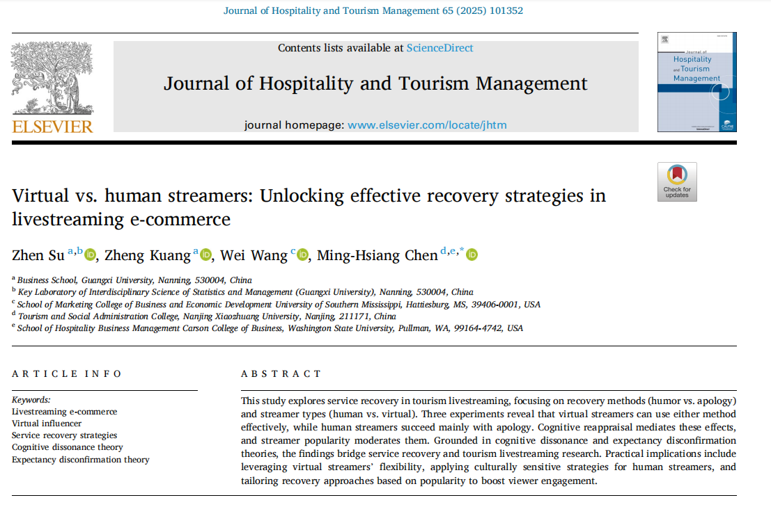 引用格式:Su, Z., Kuang, Z., Wang, W., & Chen, M. (2025). Virtual vs. human streamers: Unlocking effective recovery strategies in livestreaming e-commerce. Journal of Hospitality and Tourism Management.