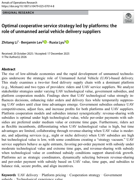 引用格式:Li, Z., Lev, B. & Lyu, R. Optimal cooperative service strategy led by platforms: the role of unmanned aerial vehicle delivery suppliers. Ann Oper Res (2026).https://doi.org/10.1007/s10479-025-07014-8.