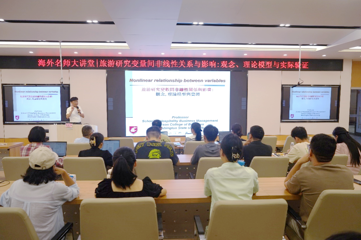 6月4日,美国华盛顿州立大学餐旅管理系陈明祥教授受邀做客mg冰球官网海外名师大讲堂,以“旅游研究变量间非线性和不对称关系与影响:观念,理论模型与实证”为题在学院122报告厅为mg冰球官网师生作学术报告。学院旅游管理系专任教师和部分研究生参加学习交流。