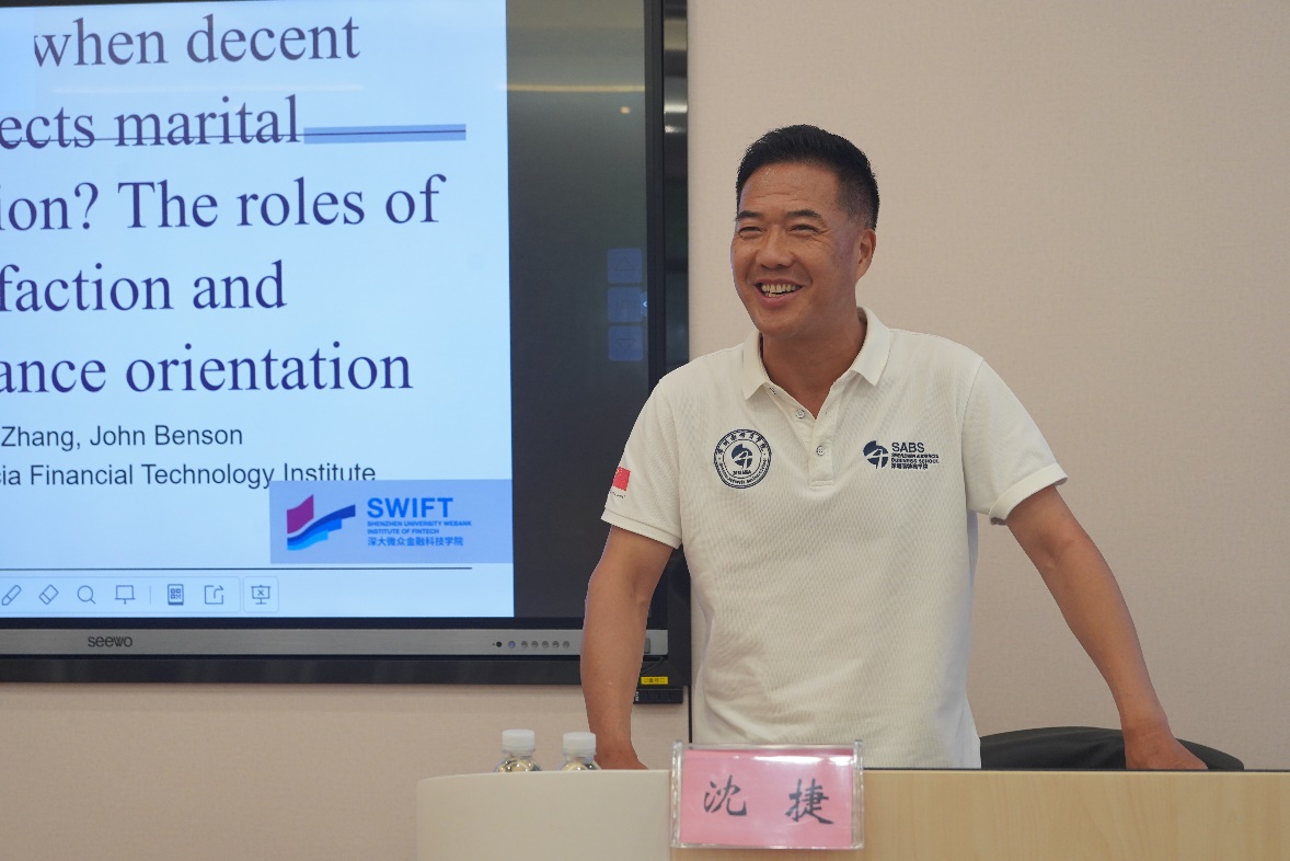 5月29日,深圳大学特聘教授、博士生导师沈捷教授受邀在学院122报告厅,以“How and when decent work affects marital satisfaction? The roles of job satisfaction and performance orientation”和“Theory applications in management research”为题为mg冰球官网师生作学术报告。学院副院长刘民坤教授主持讲座,相关研究方向的教师和研究生参加学习交流。
