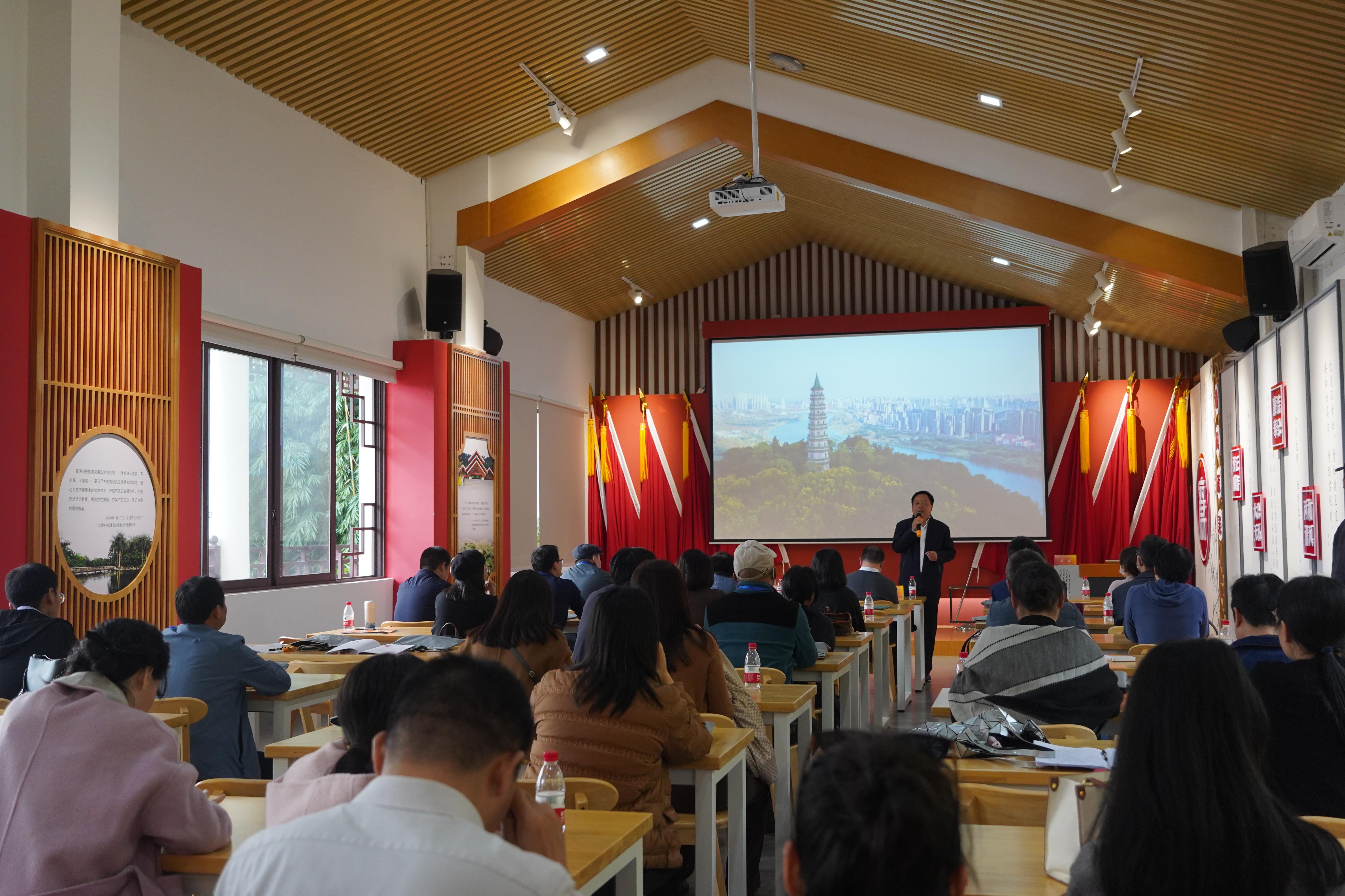 南宁青秀山风景名胜旅游区党工委书记、管委会主任梁旺(右)进行授课